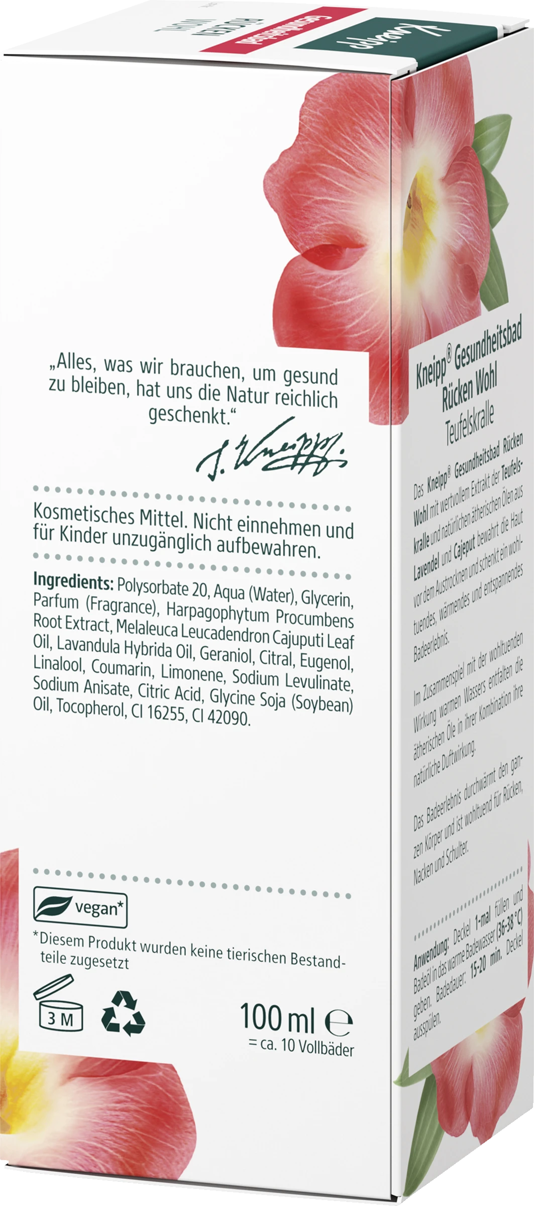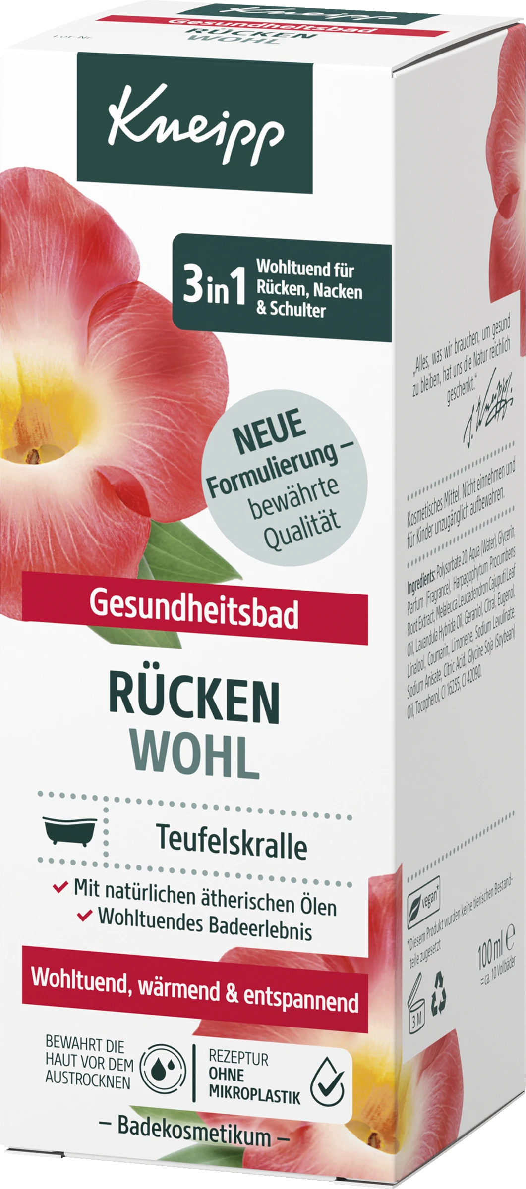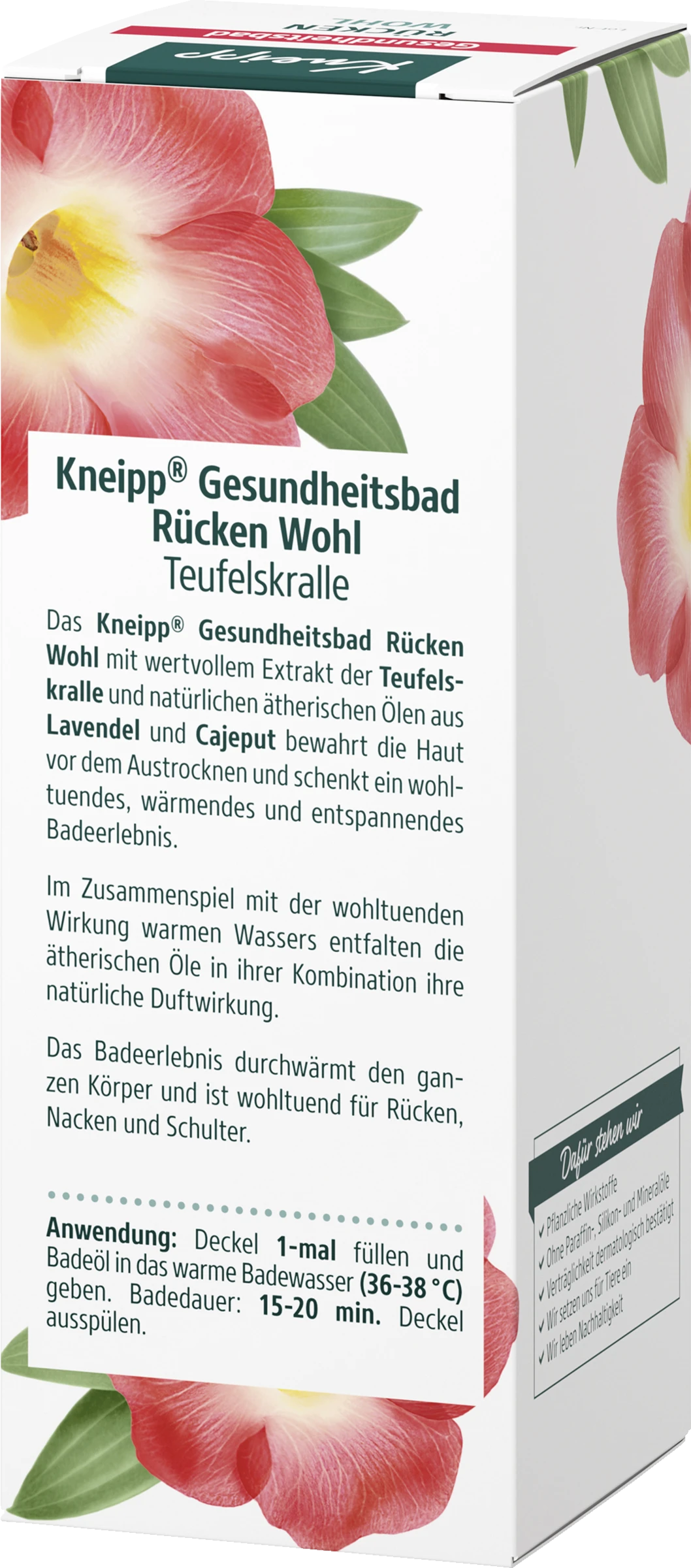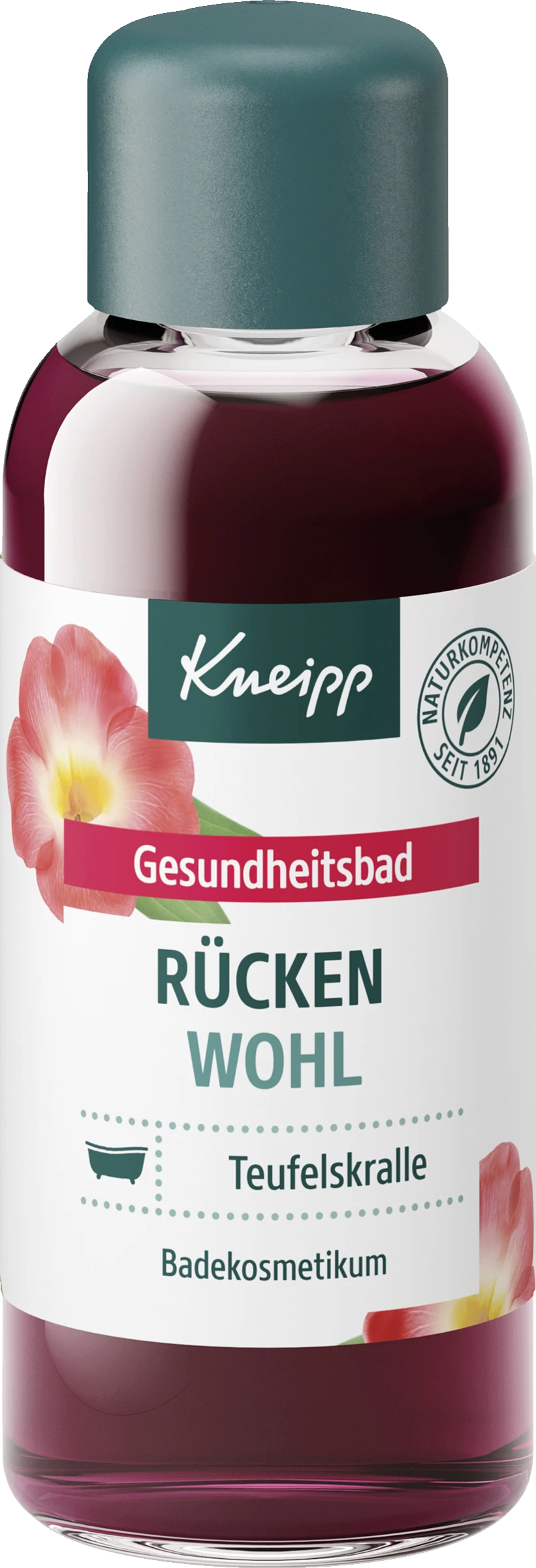 Das Kneipp® Gesundheitsbad Rücken Wohl mit wertvollem Extrakt der Teufelskralle und natürlichen ätherischen Ölen aus Lavendel und Cajeput bewahrt die Haut vor dem Austrocknen und schenkt ein wohltuendes, wärmendes und entspannendes Badeerlebnis.