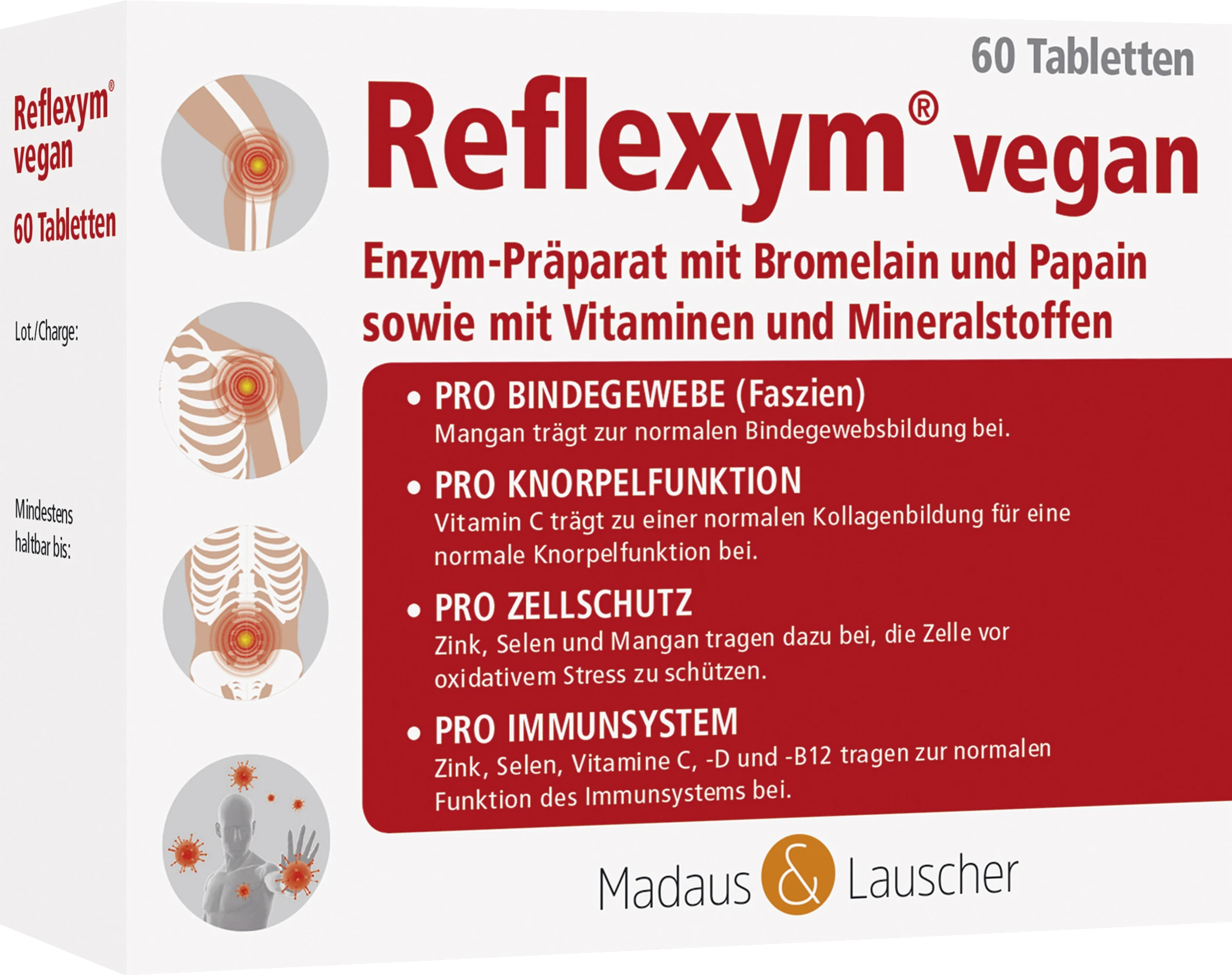 Reflexym vegan Tabletten sind ein hochwertiges Nahrungsergänzungsmittel, das neben einem pflanzlichen Enzym-Gemisch solche Stoffe enthält, die unterstützende Wirkungen auf das Bindegewebe (Mangan), den Knorpel (Vitamin C), das Immunsystem (z. B. Selen) und den Zellschutz (z. B. Zink) haben.