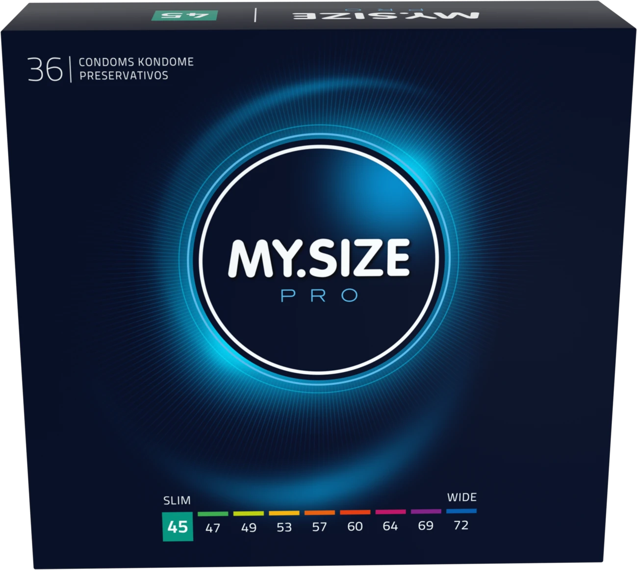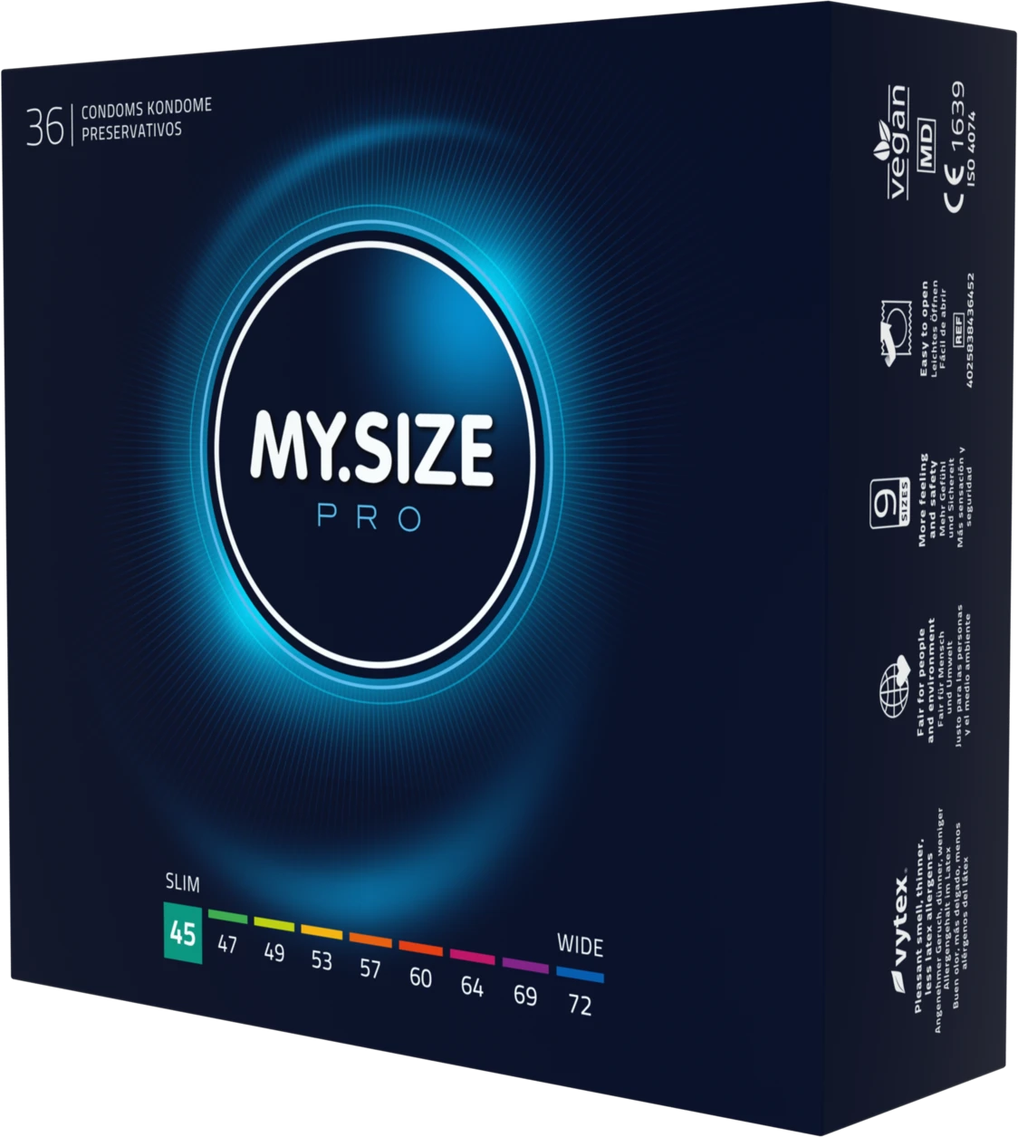MYSIZE PRO – dünne Kondome für mehr Sicherheit durch richtigen Sitz bei gleichzeitig intensivem Gefühl. Mehr Sicherheit, durch individuell abgestimmte Paßform. Besonders allergenarm und geruchsneural durch die Verwendung von hochgradig reinem VYTEX-Latex. Die minimale Wandstärke von 0,05 bis 0,06 mm ist besonders dünn und damit besonders gefühlsecht. Nachhaltig und vegan. Weit oberhalb der Norm liegende Qaulität. Alle Kondome entsprechen der EU-Richtlinie für Medizinprodukte 93/42 EWG.? MY.SIZE PRO Kondome 45 mm, glatt, zylindrisch, transparent, mit Resrvoir, mit Gleitmittel.