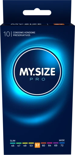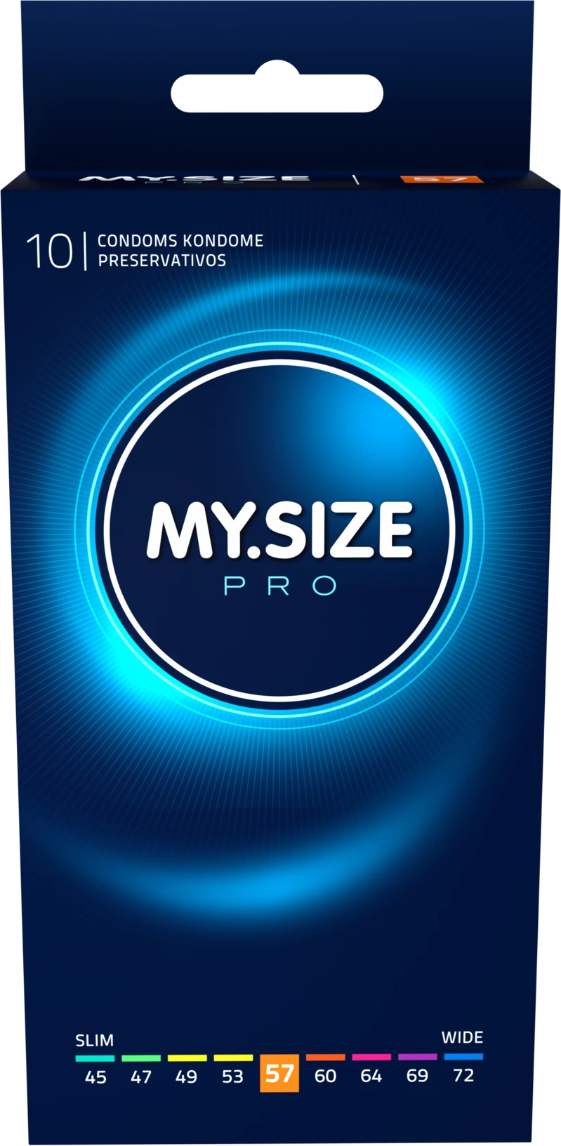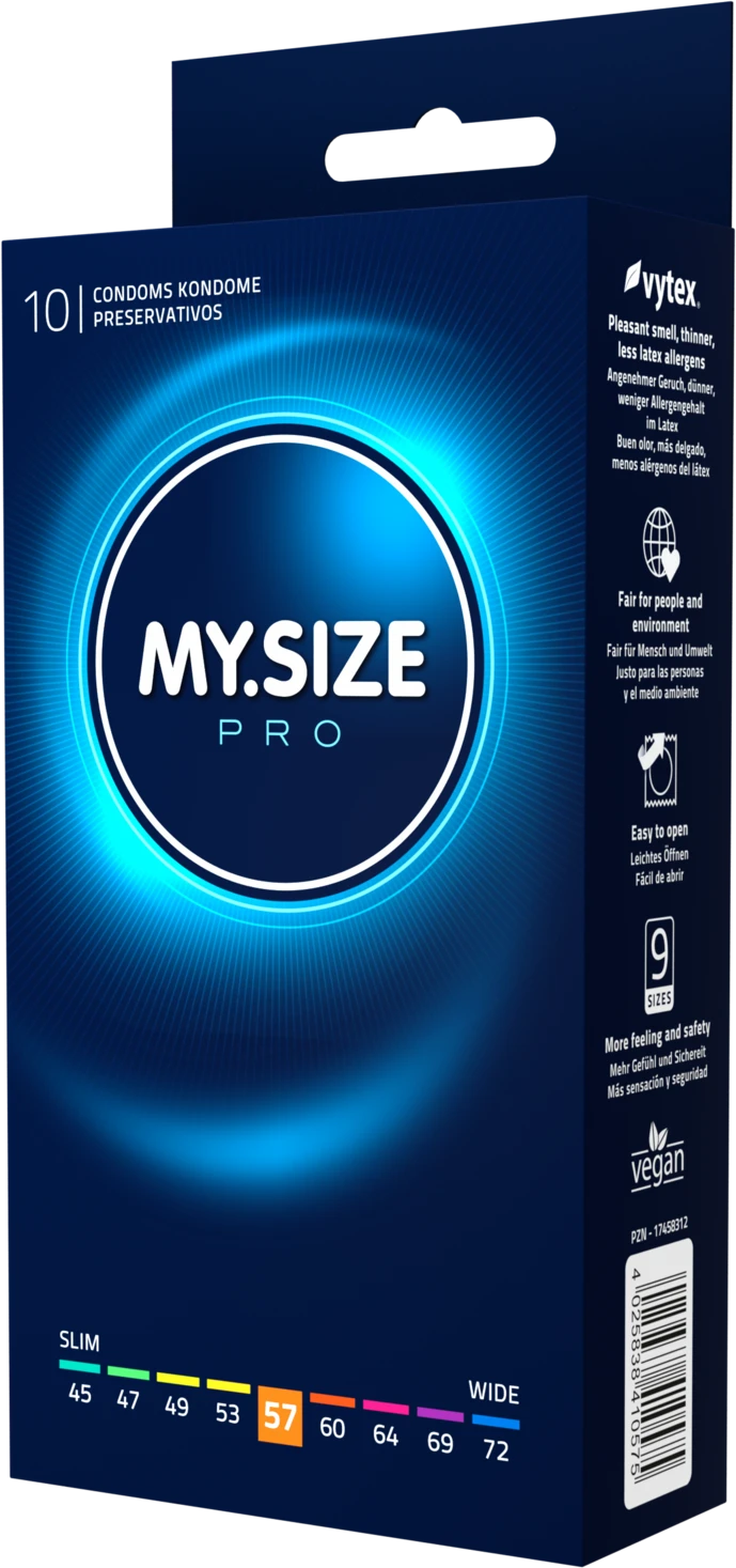 MYSIZE PRO – dünne Kondome für mehr Sicherheit durch richtigen Sitz bei gleichzeitig intensivem Gefühl. Mehr Sicherheit, durch individuell abgestimmte Paßform. Besonders allergenarm und geruchsneural durch die Verwendung von hochgradig reinem VYTEX-Latex. Die minimale Wandstärke von 0,06 bis 0,07 mm ist besonders dünn und damit besonders gefühlsecht. Nachhaltig und vegan. Weit oberhalb der Norm liegende Qaulität. Alle Kondome entsprechen der EU-Richtlinie für Medizinprodukte 93/42 EWG.? MY.SIZE PRO Kondome 57 mm, glatt, zylindrisch, transparent, mit Resrvoir, mit Gleitmittel.