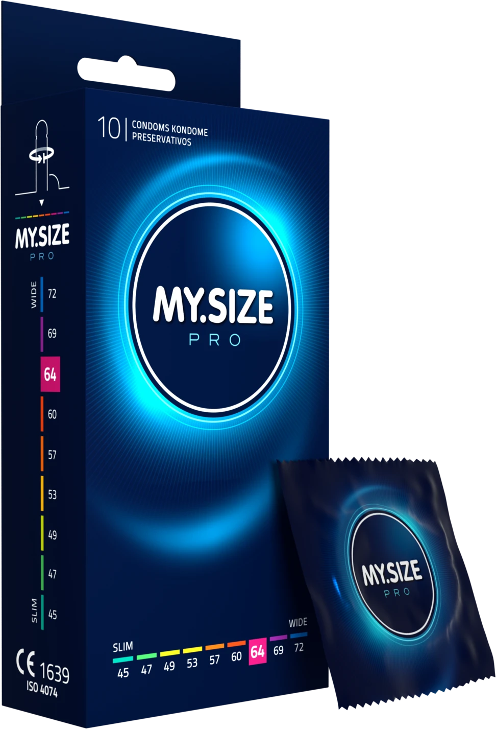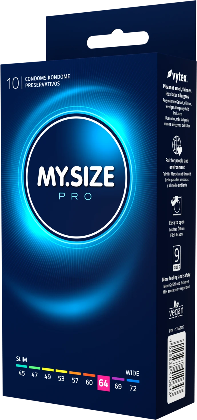 MYSIZE PRO – dünne Kondome für mehr Sicherheit durch richtigen Sitz bei gleichzeitig intensivem Gefühl. Mehr Sicherheit, durch individuell abgestimmte Paßform. Besonders allergenarm und geruchsneural durch die Verwendung von hochgradig reinem VYTEX-Latex. Die minimale Wandstärke von 0,06 bis 0,07 mm ist besonders dünn und damit besonders gefühlsecht. Nachhaltig und vegan. Weit oberhalb der Norm liegende Qaulität. Alle Kondome entsprechen der EU-Richtlinie für Medizinprodukte 93/42 EWG.? MY.SIZE PRO Kondome 64 mm, glatt, zylindrisch, transparent, mit Resrvoir, mit Gleitmittel.