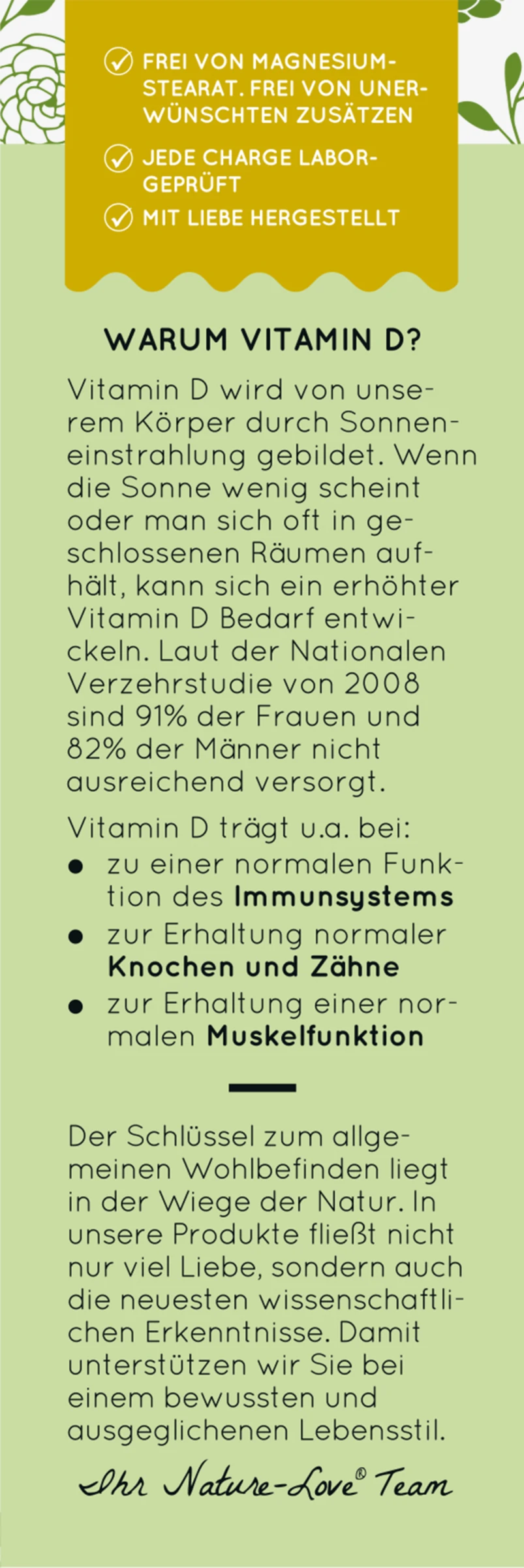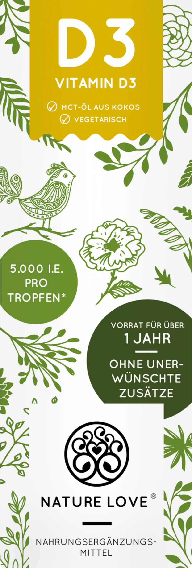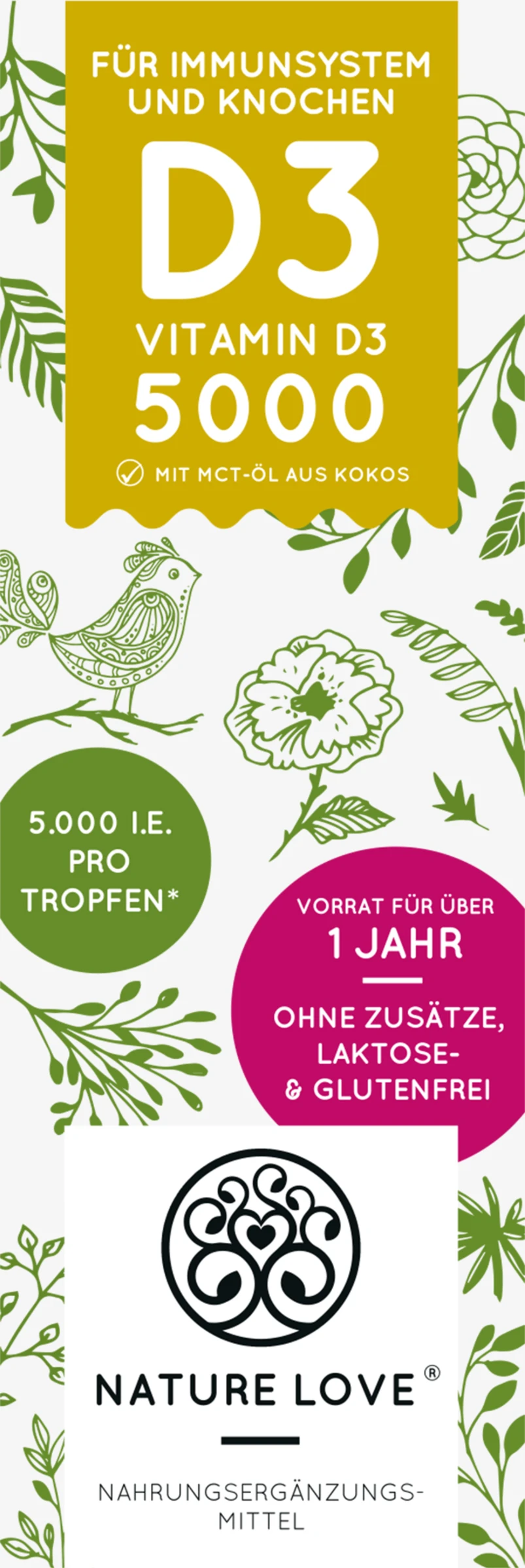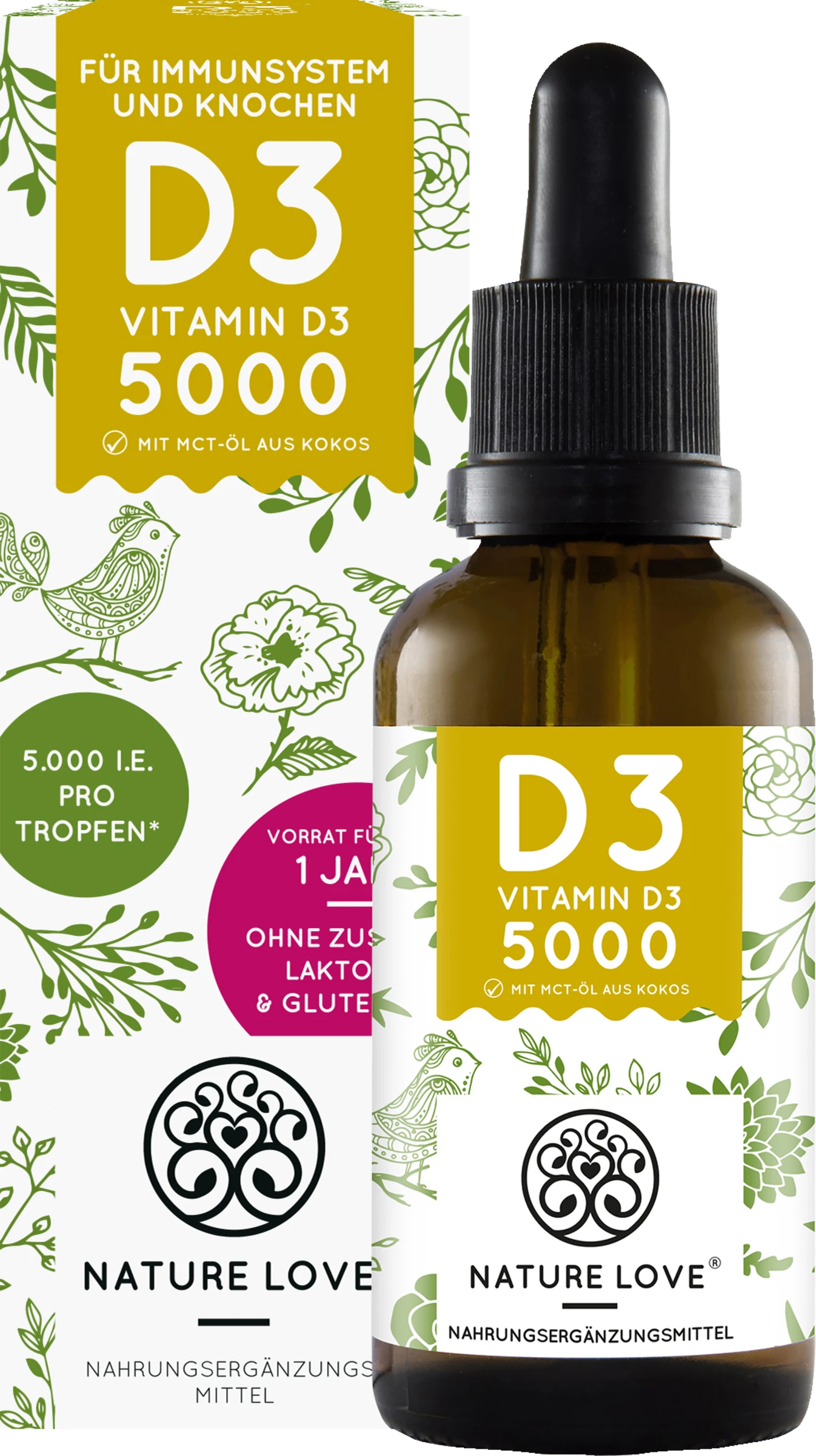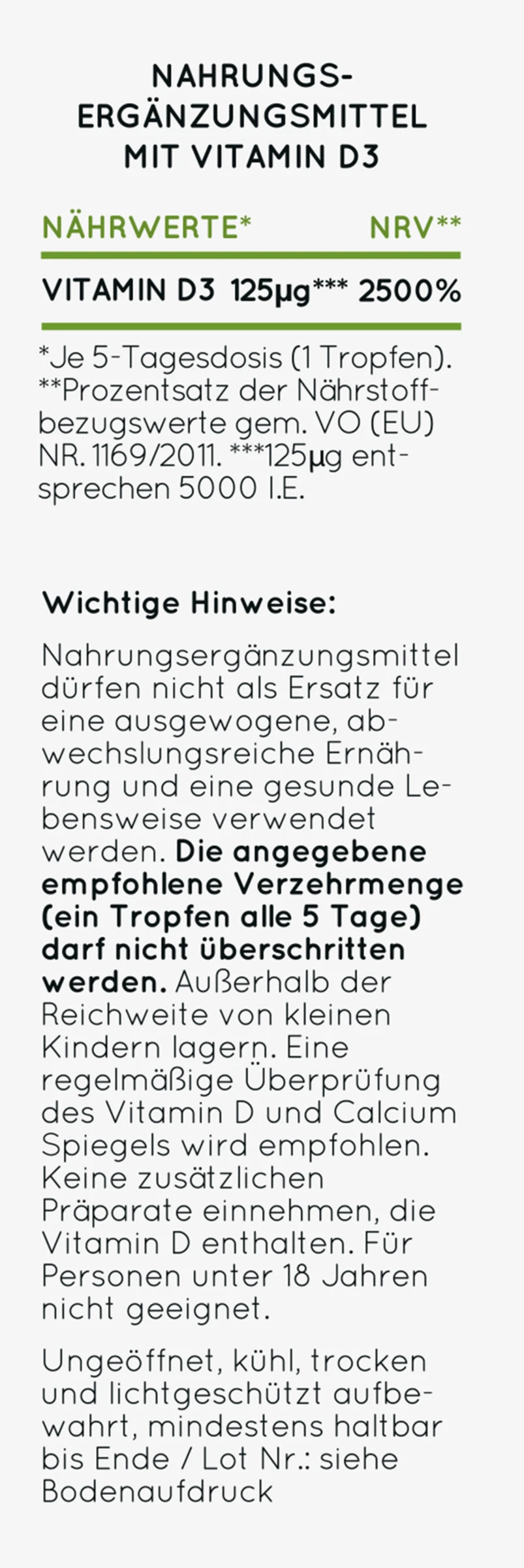 Hochdosiertes Vitamin D3 mit 5000 I.E. (125 µg) pro Tropfen, gelöst in hochwertigem MCT-Öl aus Kokos. Ein Fläschchen (50 ml) mit einer Pipette mit Naturkautschuk enthält ca. 1.700 Tropfen und reicht über 12 Monate. Vitamin D kann unser Körper durch Sonneneinstrahlung selber bilden, jedoch mangelt es laut Nationaler Verzehrsstudie 2008 über 80% der Deutschen an dem wertvollen Sonnenvitamin. Vitamin D3 trägt bei zu:
