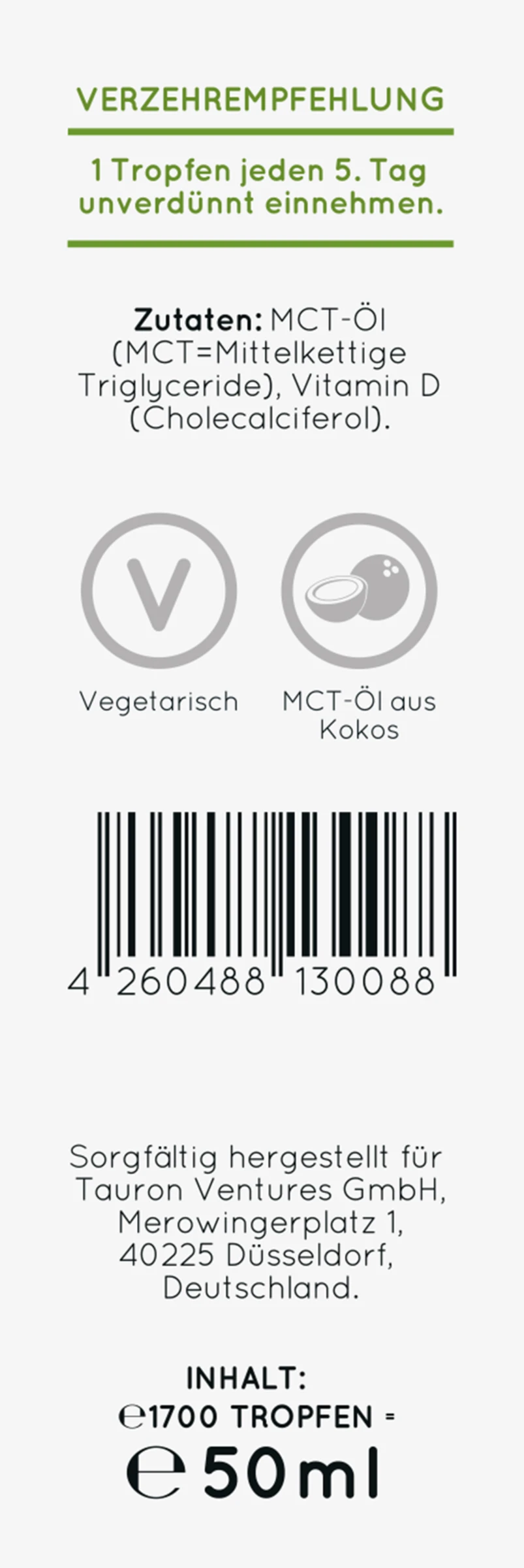 Vitamin D (Cholecalciferol), MCT-Öl (MCT=Mittelkettige Triglyceride).