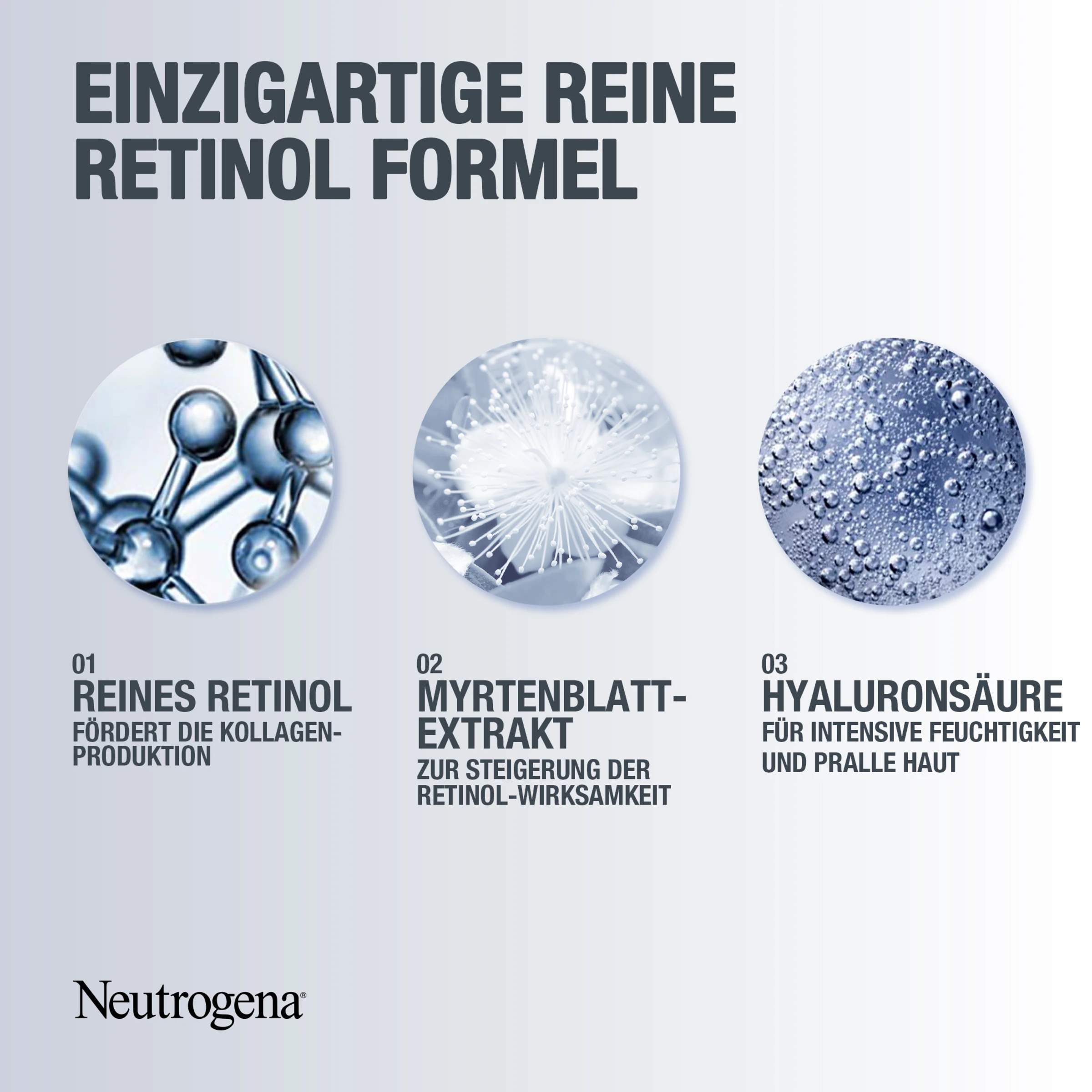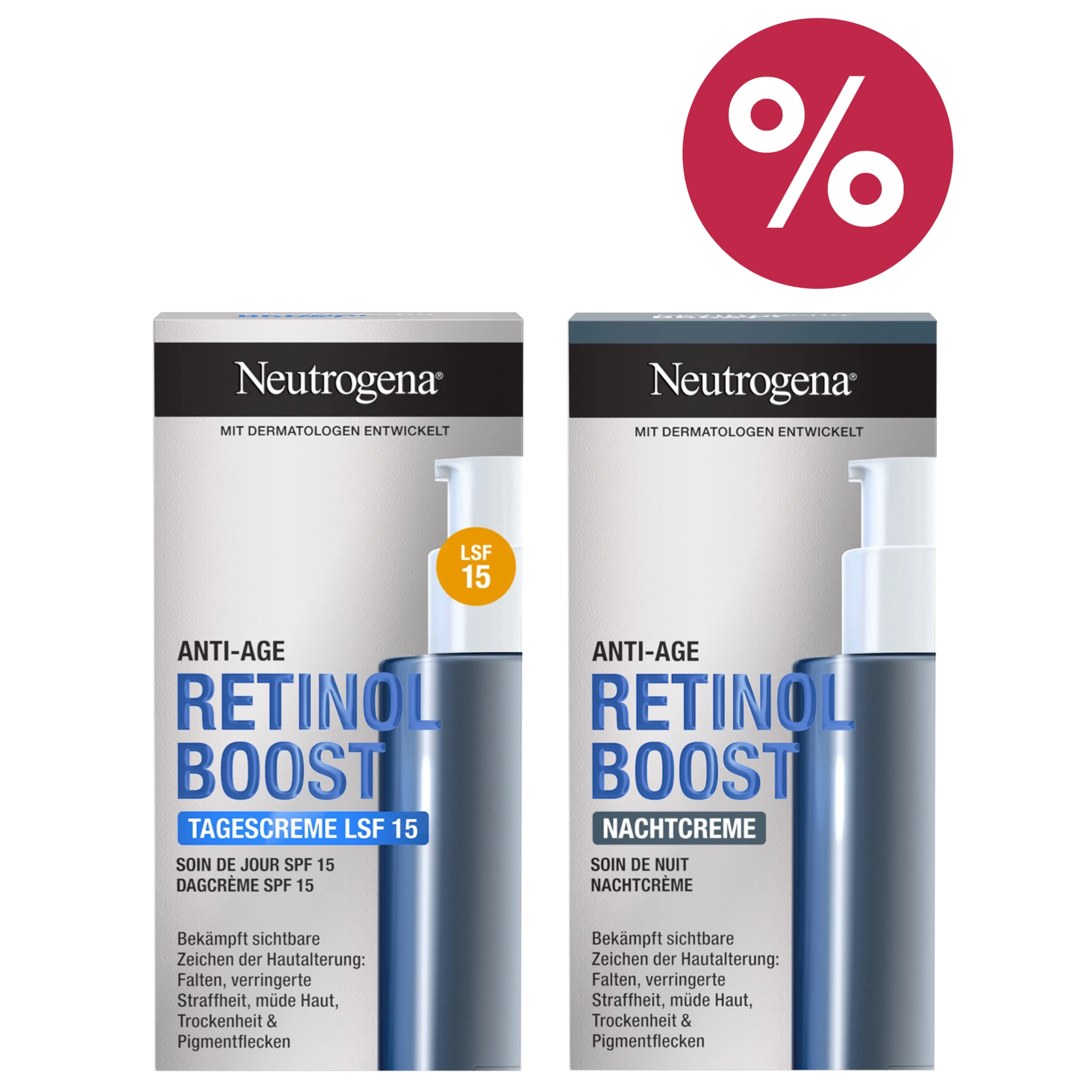 Die Neutrogena Retinol Boost Tages- & Nachtcreme ist eine schnell einziehende Anti-Age Pflege und sorgt für jünger & gesund aussehende Haut. Die effektive Gesichtscreme bekämpft sichtbare Zeichen der Hautalterung: Falten, verringerte Straffheit, müde Haut, Trockenheit und Pigmentflecken. Zusätzlich verbessert die Anti-Age Creme das Hautbild, sorgt für einen ebenmäßigen Hautton und spendet sofort Feuchtigkeit.