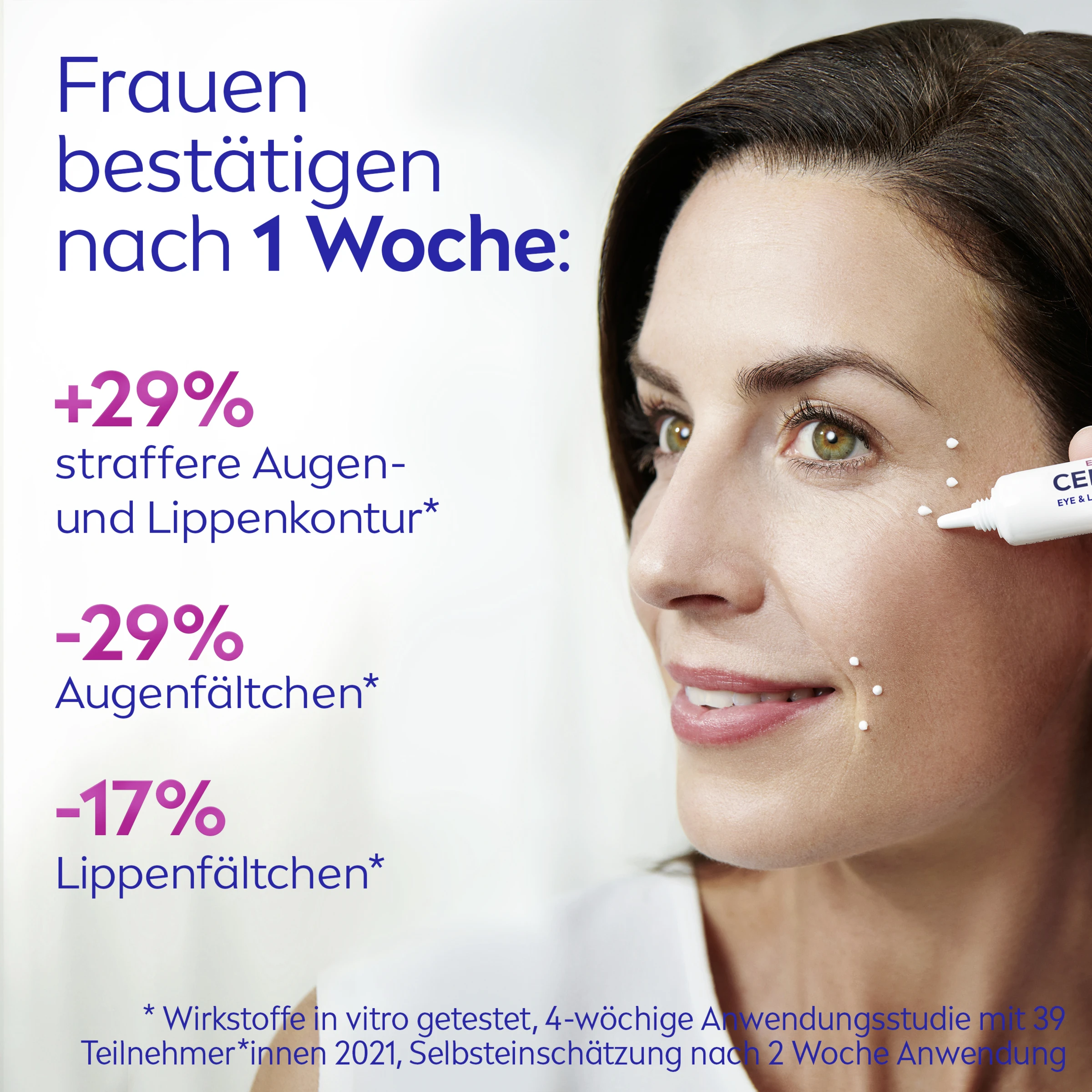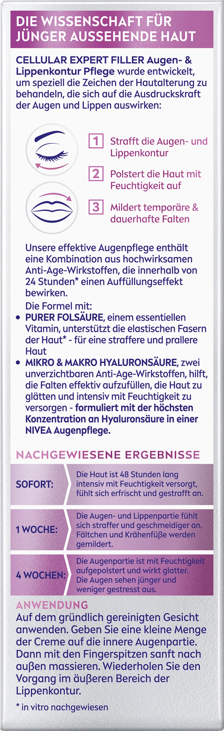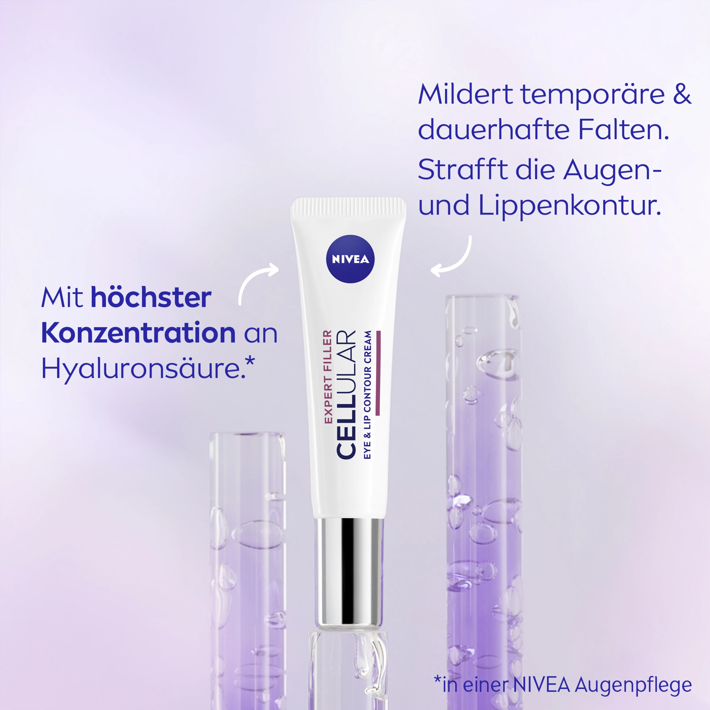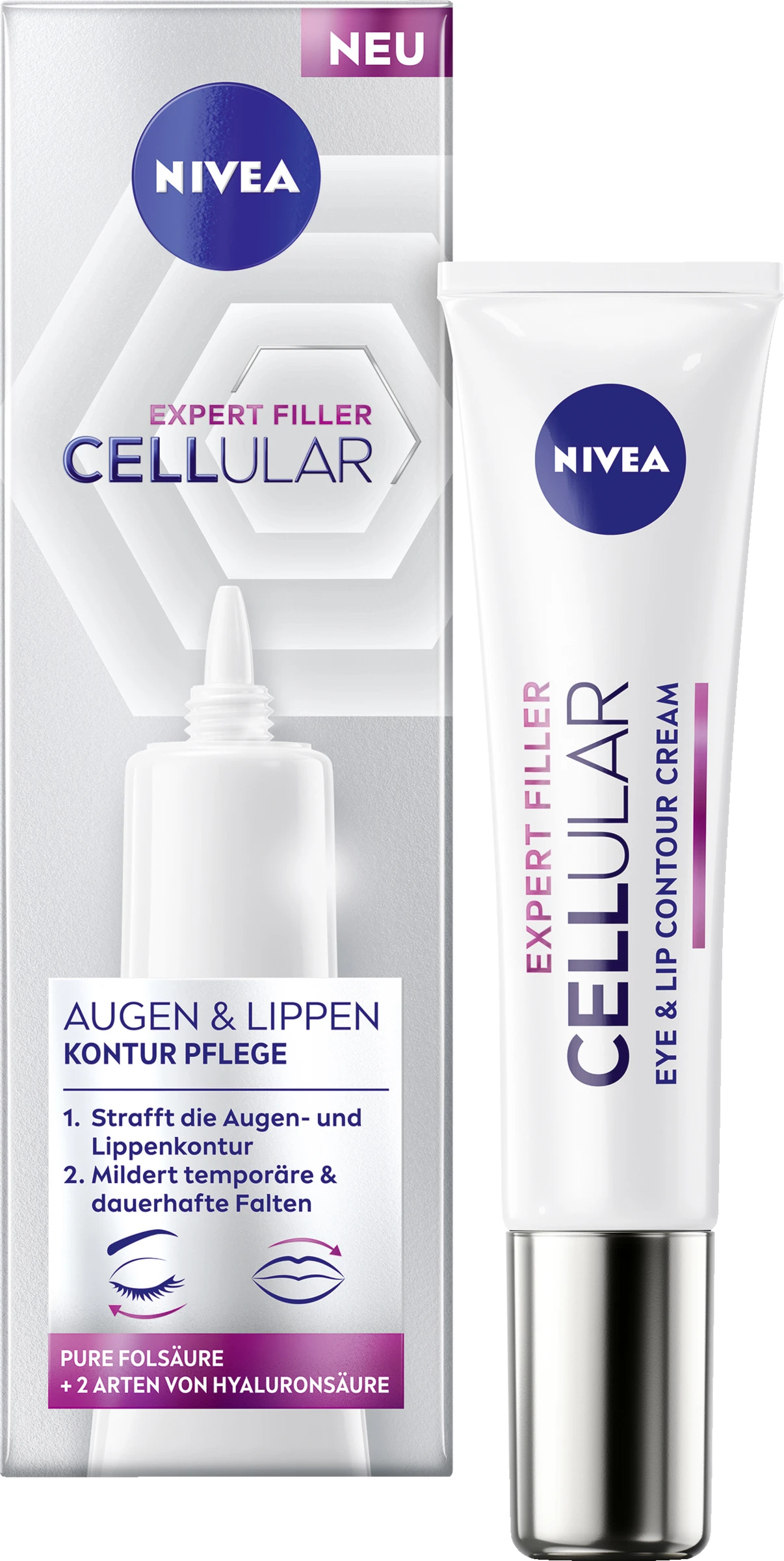 NIVEA Cellular Expert Filler Augen- & Lippenkontur Pflege mit ihrer effektiven Formel enthält eine Kombination aus hochwirksamen Anti-Age-Wirkstoffen, die innerhalb von 24 Stunden* einen Auffüllungseffekt bewirken und dem Verlust von Festigkeit und Volumen von Augen- und Lippenpartie entgegenwirken.