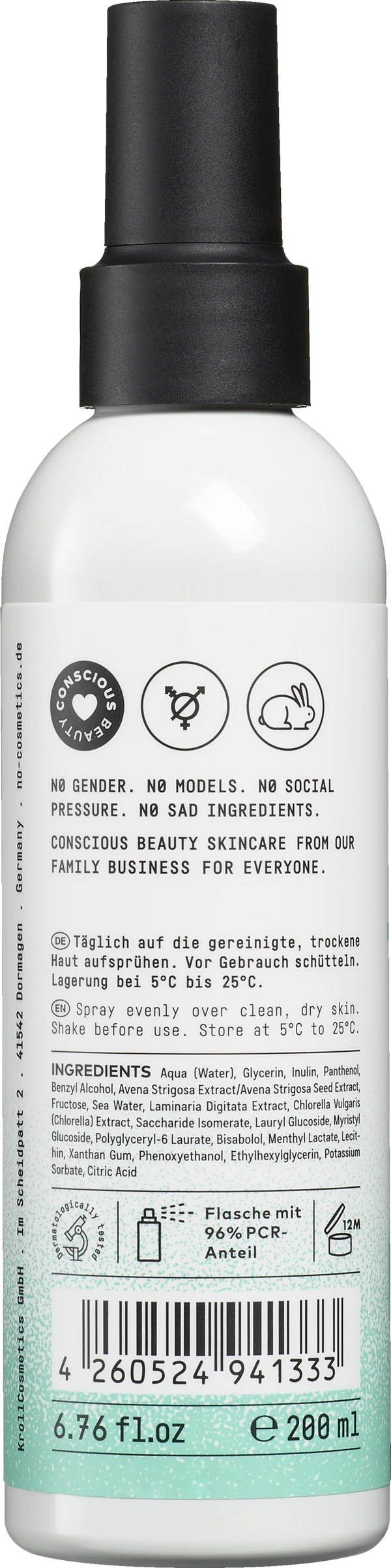 Aqua (Water), Glycerin, Inulin, Panthenol, Magnesium Aluminum Silicate, Benzyl Alcohol, Avena Strigosa Extract/Avena Strigosa Seed Extract, Fructose, Sea Water, Laminaria Digitata Extract, Chlorella Vulgaris (Chlorella) Extract, Saccharide Isomerate, Bisabolol, Menthyl Lactate, Lecithin, Xanthan Gum, Phenoxyethanol, Ethylhexylglycerin, Potassium Sorbate, Sodium Hydroxide