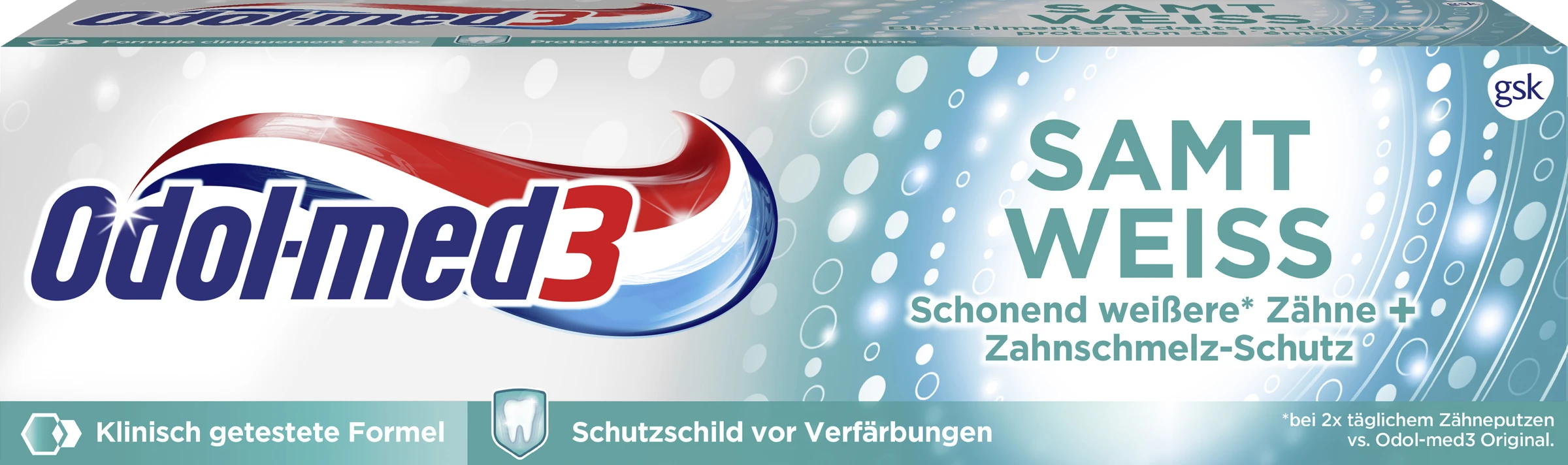Die klinisch getestete Odol-med3 Samtweiss Zahnpasta sorgt für langanhaltend, schonend weißere* Zähne und Zahnschmelz-Schutz.