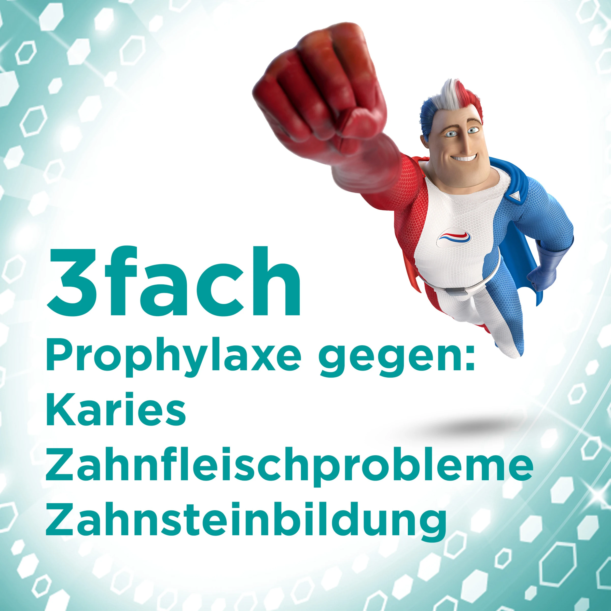 Aqua, Sorbitol, Hydrated Silica, Glycerin, Pentasodium Triphosphate, PEG-6, Sodium Lauryl Sulfate, Aroma, Alumina, Xanthan Gum, Cocamidopropyl Betaine, Carrageenan, Sodium Fluoride, Sodium Saccharin, Sodium Hydroxide, Limonene, CI 73360, CI 74160, CI 74260. Enthält: Natriumfluorid / Contient: Sodium fluoride (1450 ppm F-).