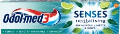 Die Odol-med3 SENSES Eukalyptus, Limette & Minze erweckt deinen Mund und deine Sinne mit einem revitalisierenden Frische-Kick. Die Zahnpasta stärkt den Zahnschmelz und schützt die Zähne. Die Zuckersäuren-Schutz-Formel* bildet einen Schutzschild gegen Zuckersäuren-Attacken – eine der Hauptursachen von Karies.