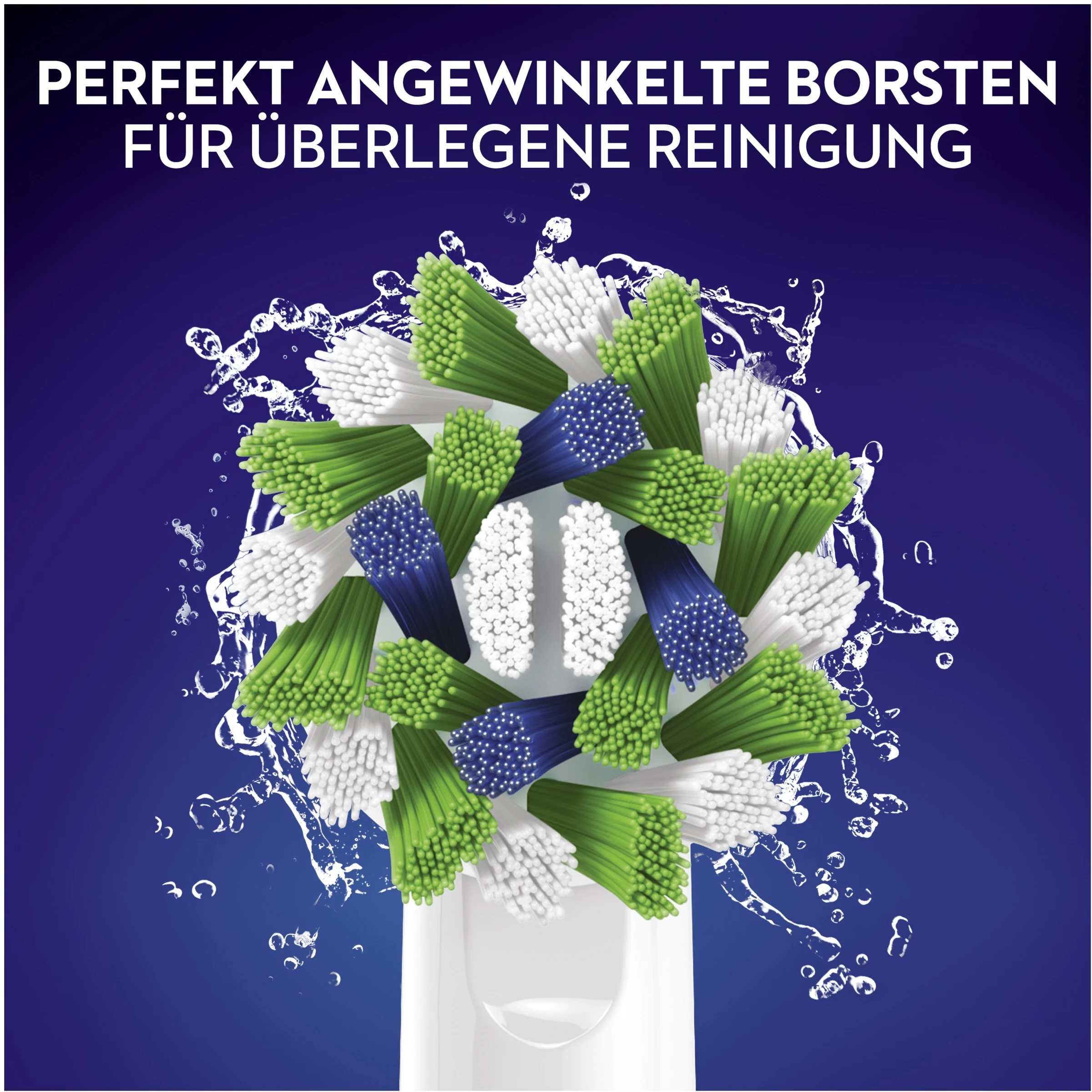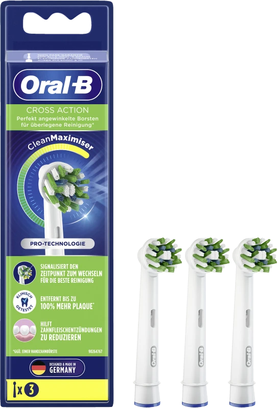Der Oral-B CrossAction Bürstenkopf verfügt über perfekt angewinkelte Borsten, die bis zu 100% mehr Plaque entfernen als eine Handzahnbürste. Die innovative CleanMaximiser-Technologie färbt grüne Borsten gelb und signalisiert so den optimalen Zeitpunkt zum Wechseln für die beste Reinigung.