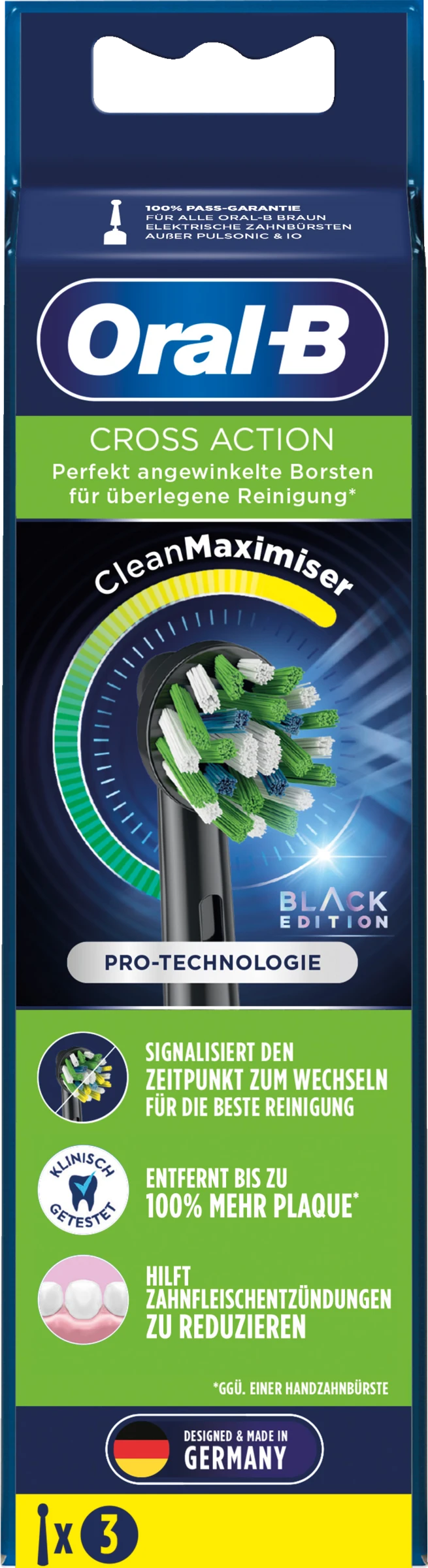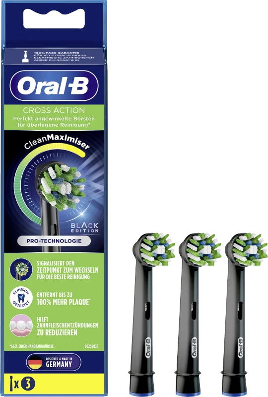 Der Oral-B CrossAction Bürstenkopf wurde von Stiftung Warentest als Testsieger mit der Note GUT (1,7) ausgezeichnet (Ausgabe 12/2019). Er verfügt über perfekt angewinkelte Borsten, die bis zu 100% mehr Plaque entfernen als eine Handzahnbürste. Die innovative CleanMaximiser-Technologie färbt grüne Borsten gelb und signalisiert so den optimalen Zeitpunkt zum Wechseln für die beste Reinigung. 100% Pass-Garantie für alle Oral-B Braun elektrische Zahnbürsten, außer Pulsonic & iO. Designed & made in Germany.