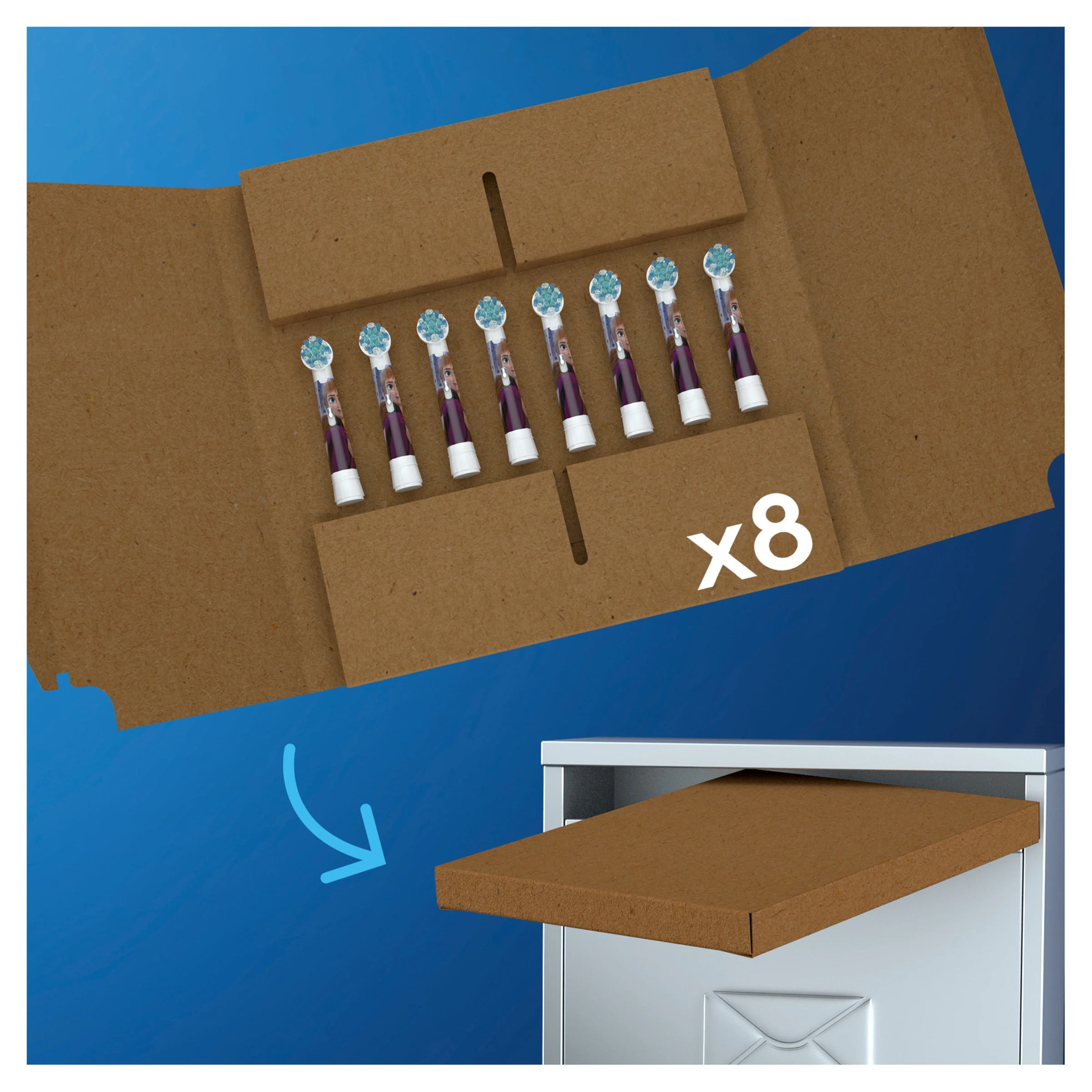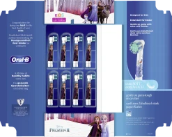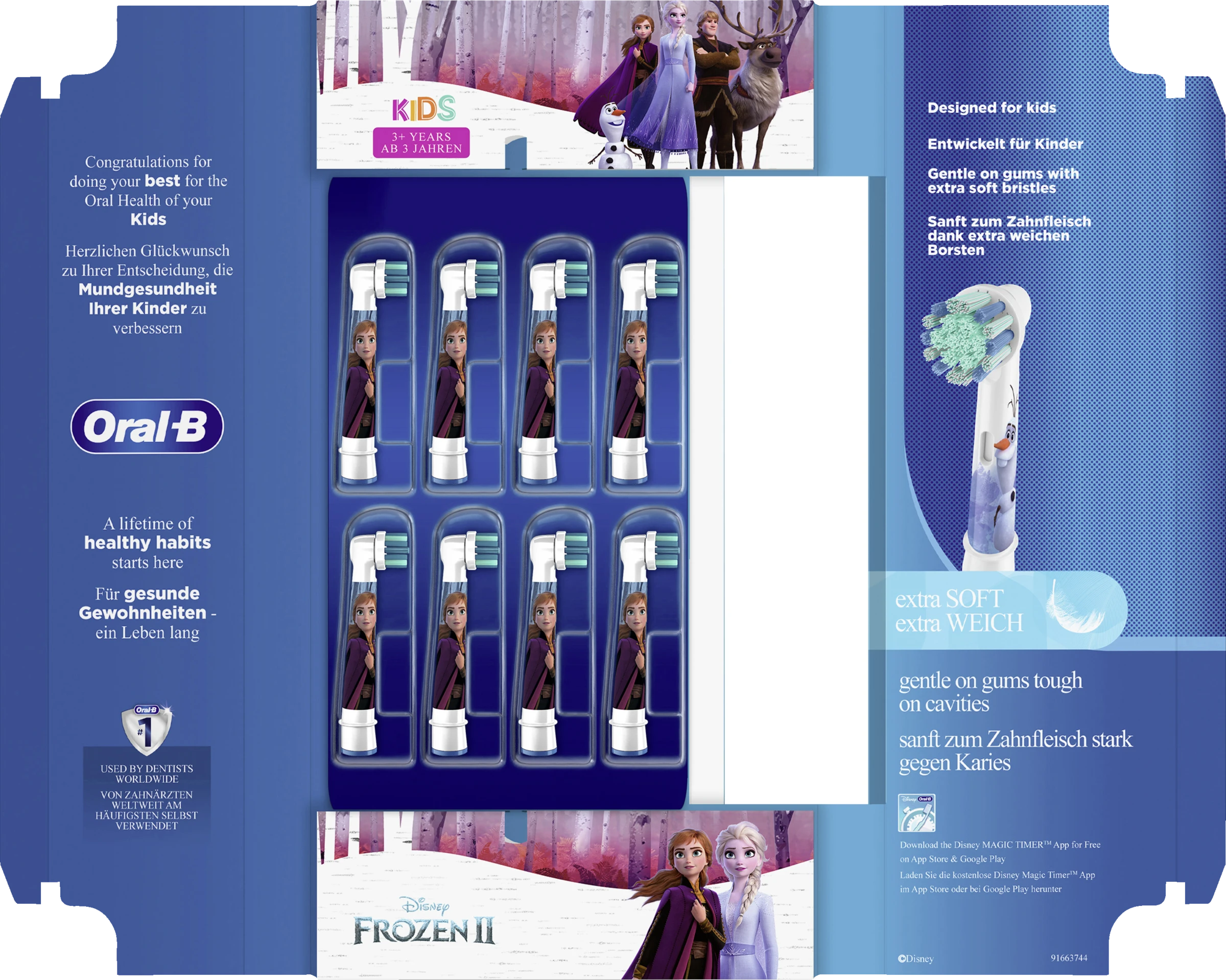 Die Oral-B Kids Frozen Ersatz-Aufsteckbürsten für elektrischeZahnbürsten wurden speziell für Kinder ab 3 Jahren entwickelt. Der verbesserte kleine Bürstenkopf mit extra weichen Borsten passt perfekt in einen Kindermund und reinigt die Zähne und das Zahnfleisch besonders sanft. Jede Aufsteckbürste ist mit Frozen-Figuren bedruckt, die für noch mehr Spaß beim Zähneputzen sorgen. Kompatibel mit allen Oral-B Kids elektrischen Zahnbürste.