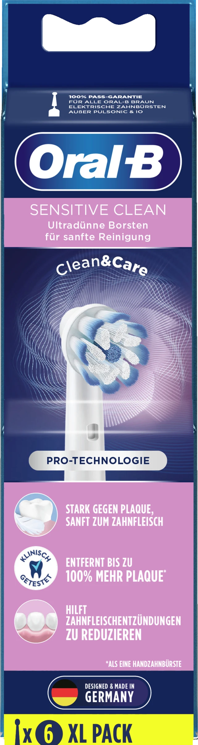 Der Oral-B Sensitive Clean Bürstenkopf ist stark gegen Plaque und sanft zum Zahnfleisch. Die ultra-dünnen Borsten helfen Zahnfleischentzündungen zu reduzieren und entfernen sanft bis zu 100% mehr Plaque als eine Handzahnbürste. 100% Pass-Garantie für alle Oral-B Braun elektrische Zahnbürsten, außer Pulsonic & iO. Designed & made in Germany.