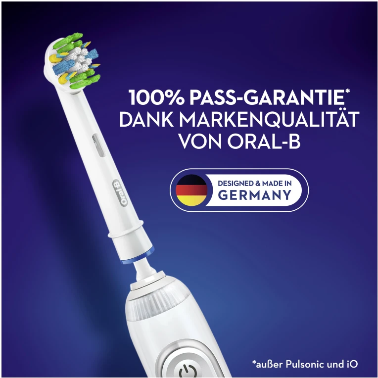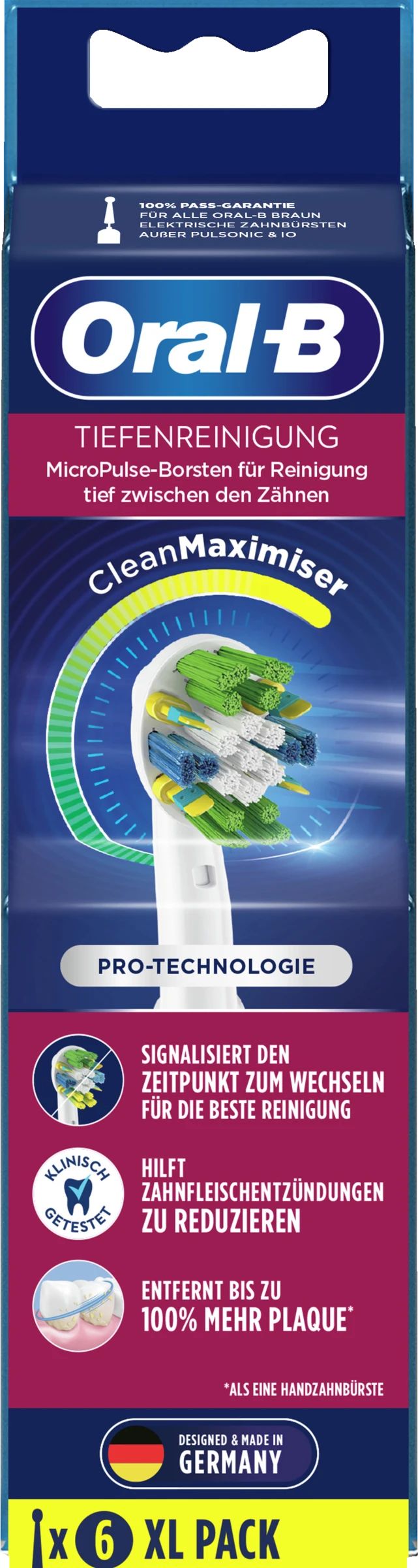 Der Oral-B Tiefenreinigung Bürstenkopf sorgt mit den speziellen MicroPulse-Borsten für eine tiefe Reinigung zwischen den Zähnen. Er hilft Zahnfleischentzündungen zu reduzieren und entfernt bis zu 100% mehr Plaque als eine Handzahnbürste. Die innovative CleanMaximiser-Technologie färbt grüne Borsten gelb und signalisiert so den optimalen Zeitpunkt zum Wechseln für die beste Reinigung. 100% Pass-Garantie für alle Oral-B Braun elektrische Zahnbürsten, außer Pulsonic & iO. Designed & made in Germany.