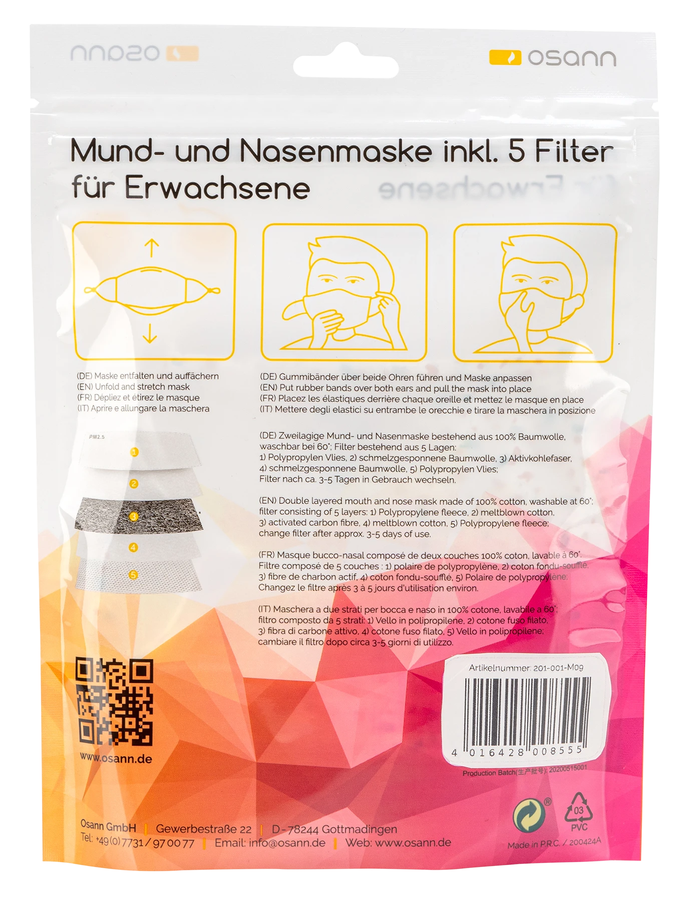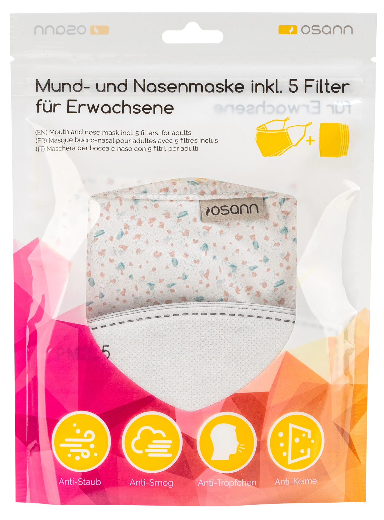 Die Corona-Krise schränkt unser soziales Leben ein und erfordert Maßnahmen, um sich und andere zu schützen. Das Gebot der Stunde lautet: Abstand halten. Um dennoch Einkäufe für den täglichen Bedarf und darüber hinaus erledigen zu können, schafft die Mund-und-Nasenmaske Abhilfe. Ausgestattet mit einer waschbaren Basis sowie austauschbaren Kohlefiltern, können die in versiegelten PVC-Beuteln gelieferten Masken dabei unterstützen, die Verbreitung eigener Tröpfchen zu verhindern. So wird die Gefahr der Ansteckung – insbesondere für die Risikogruppe – durch Menschen, die den Virus symptomfrei in sich tragen, verringert. Neben ihrem hohen Tragekomfort macht die Maske aus dem Hause Osann auch optisch etwas her: Es stehen jeweils mehrere modische Designs für Erwachsene und Kinder zur Auswahl. Übrigens: Die austauschbaren Filter gibt’s zum Nachbestellen im Fünferpack. So kann die wiederverwendbare Mund-und-Nasenmaske auch in Sachen Nachhaltigkeit punkten!