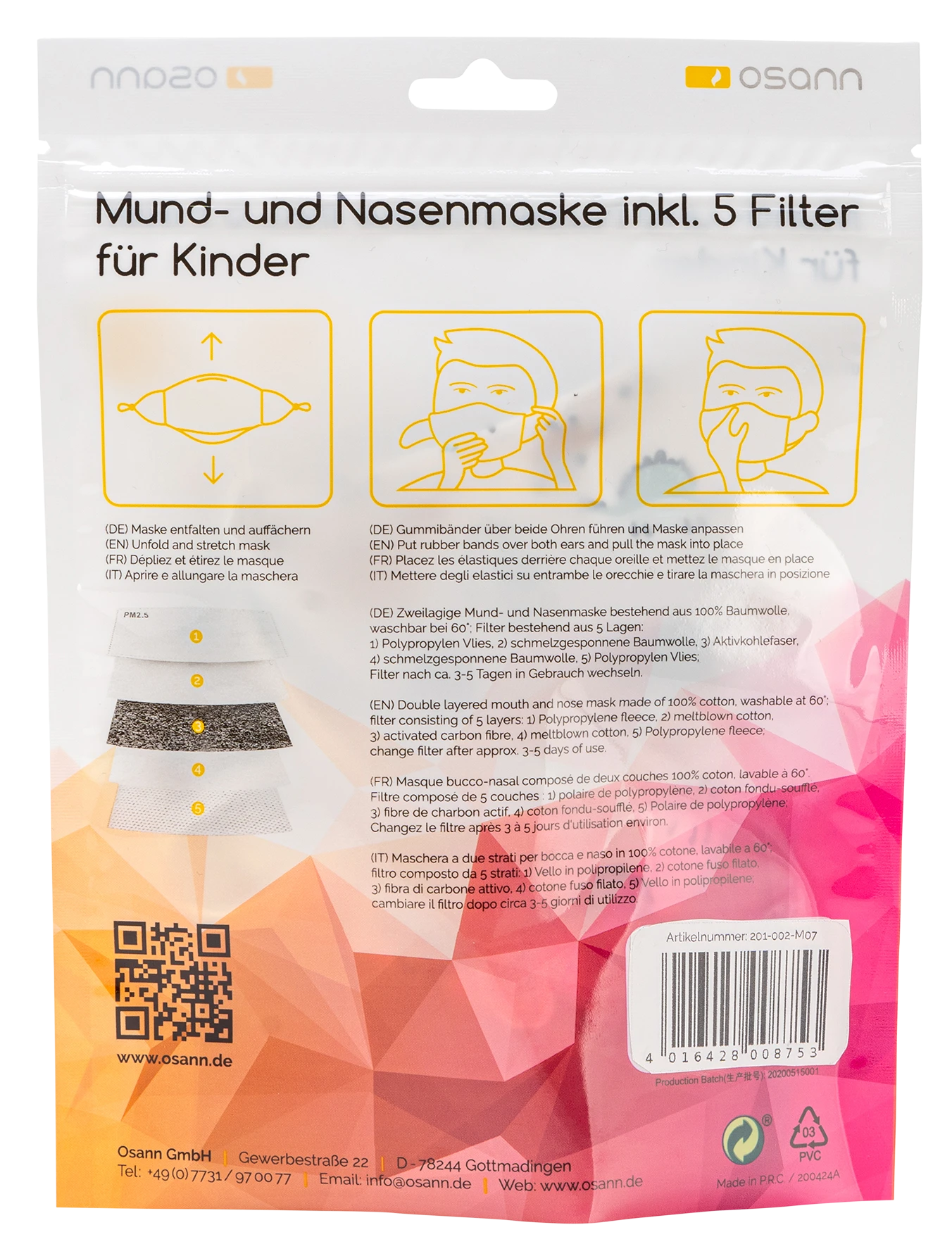 Die Corona-Krise schränkt unser soziales Leben ein und erfordert Maßnahmen, um sich und andere zu schützen. Das Gebot der Stunde lautet: Abstand halten. Um dennoch Einkäufe für den täglichen Bedarf und darüber hinaus erledigen zu können, schafft die Mund-und-Nasenmaske Abhilfe. Ausgestattet mit einer waschbaren Basis sowie austauschbaren Kohlefiltern, können die in versiegelten PVC-Beuteln gelieferten Masken dabei unterstützen, die Verbreitung eigener Tröpfchen zu verhindern. So wird die Gefahr der Ansteckung – insbesondere für die Risikogruppe – durch Menschen, die den Virus symptomfrei in sich tragen, verringert. Neben ihrem hohen Tragekomfort macht die Maske aus dem Hause Osann auch optisch etwas her: Es stehen jeweils mehrere modische Designs für Erwachsene und Kinder zur Auswahl. Übrigens: Die austauschbaren Filter gibt’s zum Nachbestellen im Fünferpack. So kann die wiederverwendbare Mund-und-Nasenmaske auch in Sachen Nachhaltigkeit punkten!