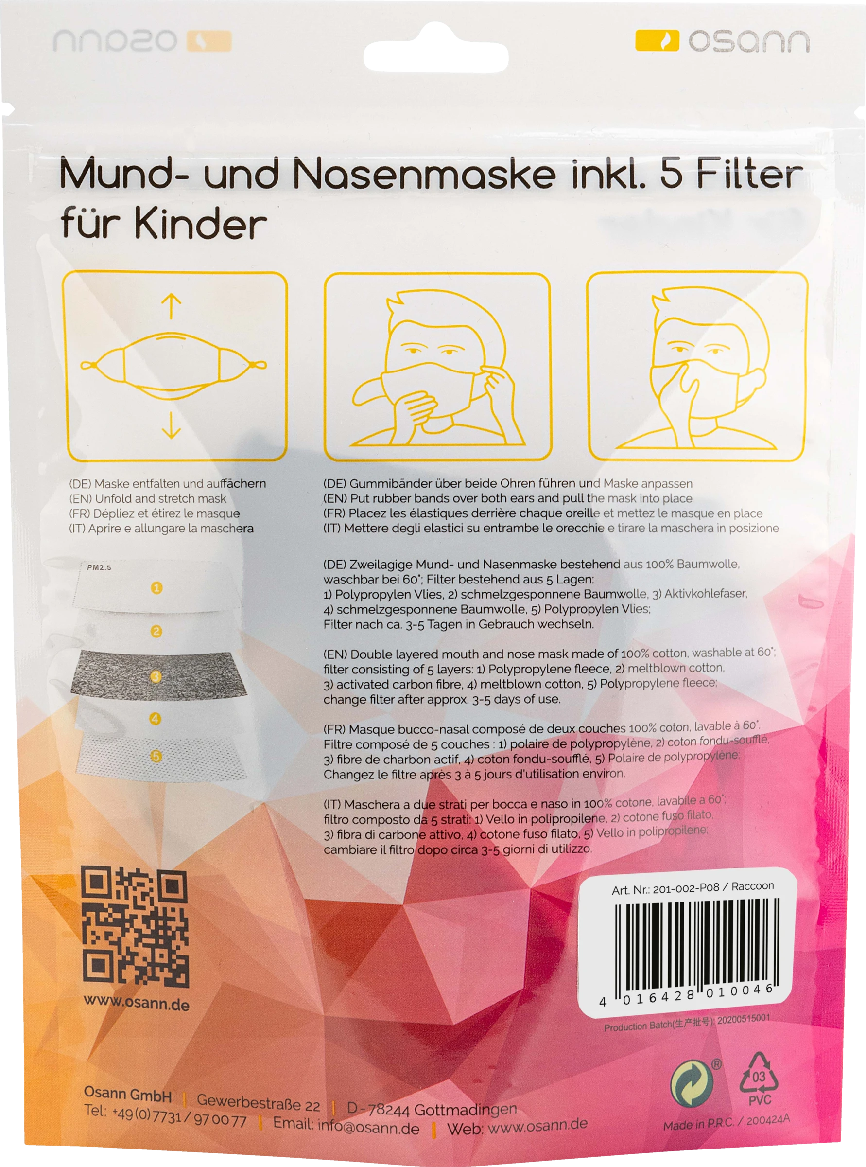 Die Corona-Krise schränkt unser soziales Leben ein und erfordert Maßnahmen, um sich und andere zu schützen. Das Gebot der Stunde lautet: Abstand halten. Um dennoch Einkäufe für den täglichen Bedarf und darüber hinaus erledigen zu können, schafft die Mund-und-Nasenmaske Abhilfe. Ausgestattet mit einer waschbaren Basis sowie austauschbaren Kohlefiltern, können die in versiegelten PVC-Beuteln gelieferten Masken dabei unterstützen, die Verbreitung eigener Tröpfchen zu verhindern. So wird die Gefahr der Ansteckung – insbesondere für die Risikogruppe – durch Menschen, die den Virus symptomfrei in sich tragen, verringert. Neben ihrem hohen Tragekomfort macht die Maske aus dem Hause Osann auch optisch etwas her: Es stehen jeweils mehrere modische Designs für Erwachsene und Kinder zur Auswahl. Übrigens: Die austauschbaren Filter gibt’s zum Nachbestellen im Fünferpack. So kann die wiederverwendbare Mund-und-Nasenmaske auch in Sachen Nachhaltigkeit punkten!