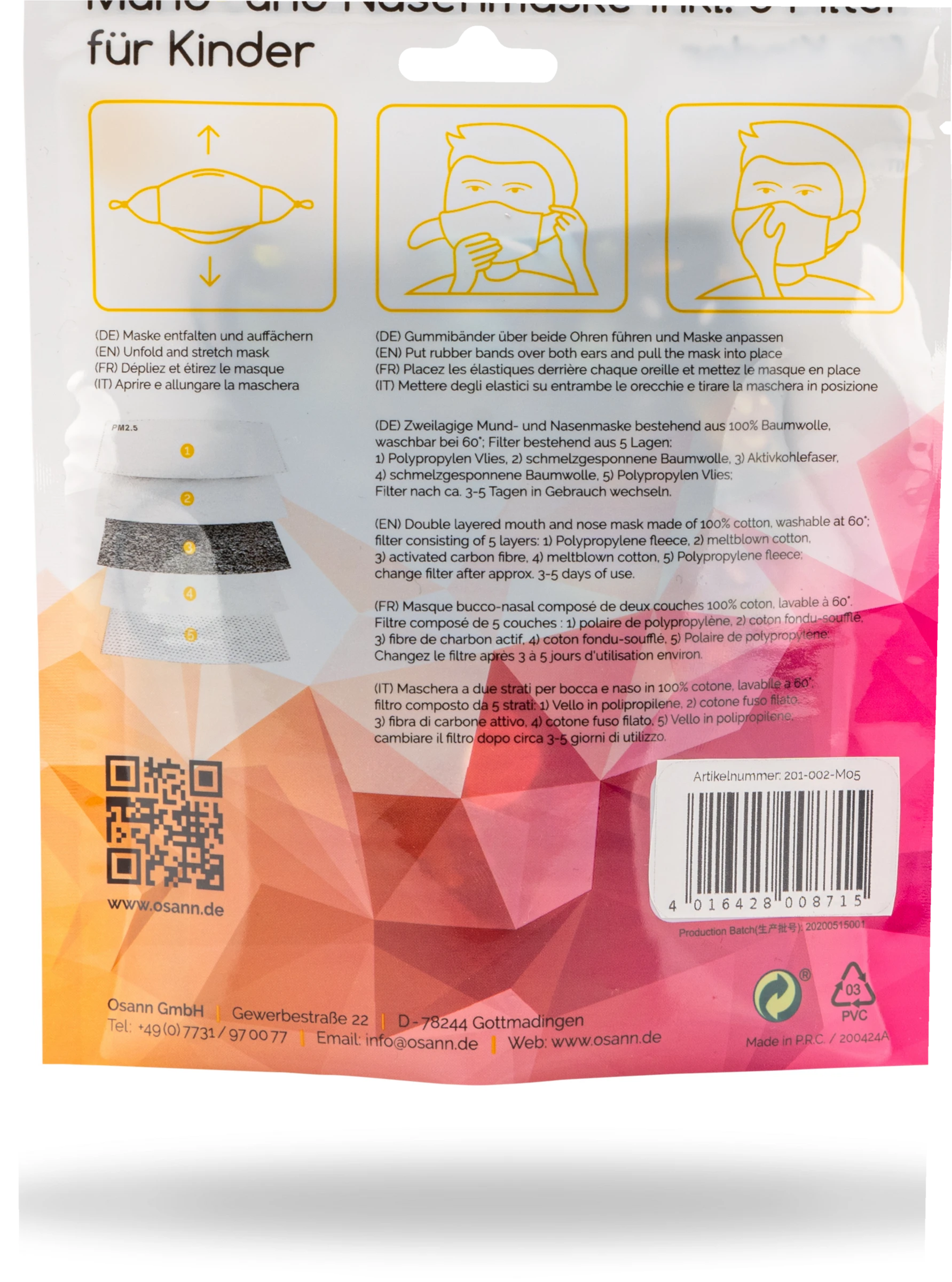 Die Corona-Krise schränkt unser soziales Leben ein und erfordert Maßnahmen, um sich und andere zu schützen. Das Gebot der Stunde lautet: Abstand halten. Um dennoch Einkäufe für den täglichen Bedarf und darüber hinaus erledigen zu können, schafft die Mund-und-Nasenmaske Abhilfe. Ausgestattet mit einer waschbaren Basis sowie austauschbaren Kohlefiltern, können die in versiegelten PVC-Beuteln gelieferten Masken dabei unterstützen, die Verbreitung eigener Tröpfchen zu verhindern. So wird die Gefahr der Ansteckung – insbesondere für die Risikogruppe – durch Menschen, die den Virus symptomfrei in sich tragen, verringert. Neben ihrem hohen Tragekomfort macht die Maske aus dem Hause Osann auch optisch etwas her: Es stehen jeweils mehrere modische Designs für Erwachsene und Kinder zur Auswahl. Übrigens: Die austauschbaren Filter gibt’s zum Nachbestellen im Fünferpack. So kann die wiederverwendbare Mund-und-Nasenmaske auch in Sachen Nachhaltigkeit punkten!