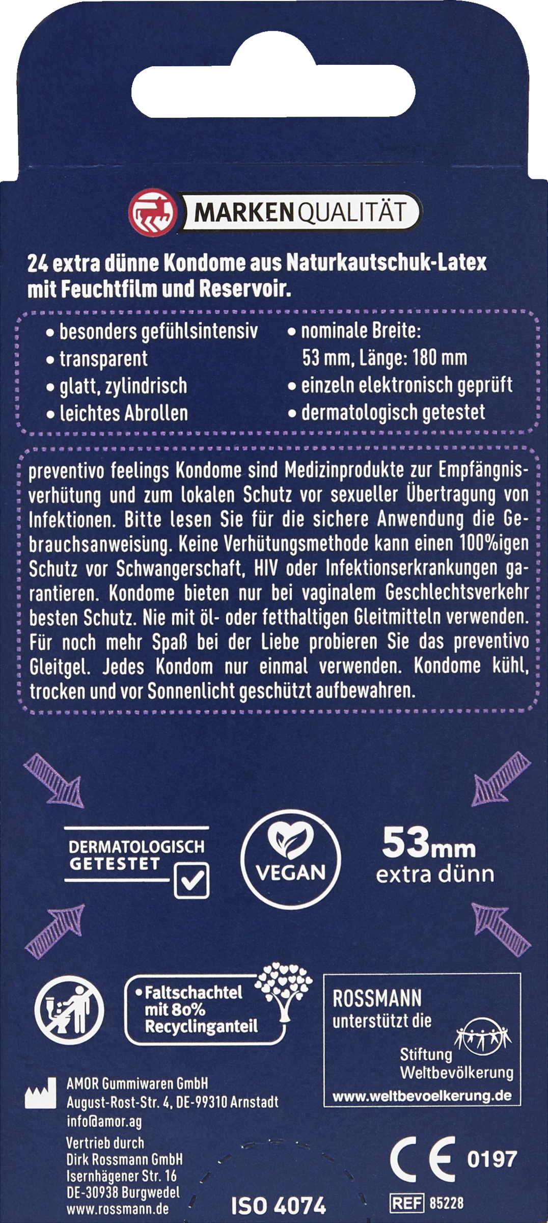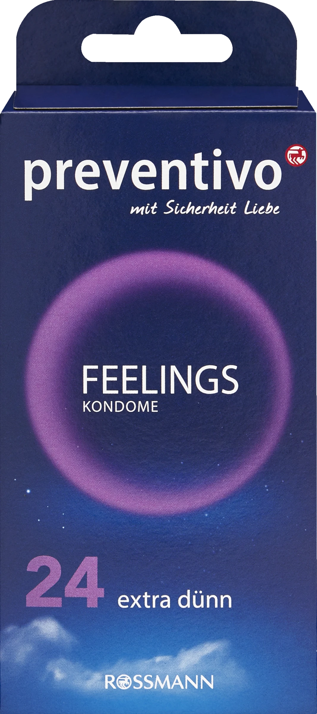 preventivo feelings Kondome sind Medizinprodukte zur Empfängnisverhütung und zum lokalen Schutz vor sexueller Übertragung von Infektionen. Keine Verhütungsmethode kann einen hundertprozentigen Schutz vor Schwangerschaft, HIV oder Infektionserkrankungen garantieren. Kondome bieten nur bei vaginalem Geschlechtsverkehr besten Schutz. Nie mit Öl oder fetthaltigen Gleitmitteln verwenden. Jedes Kondom nur einmal verwenden.