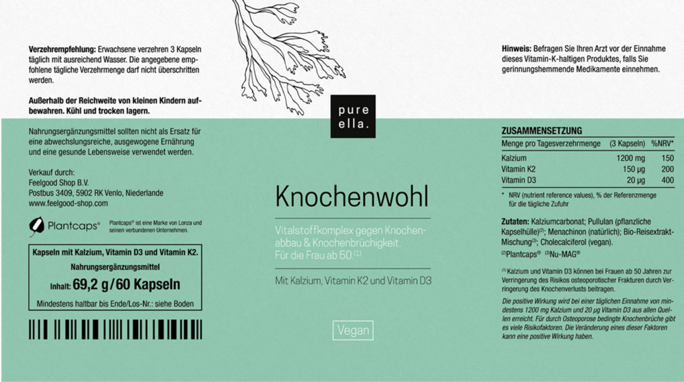 Kalziumcarbonat; Pullulan (vegane Kapselhülle)2; Menachinon (natürlich); Bio-Reisextrakt-Mischung3; Cholecalciferol (vegan).