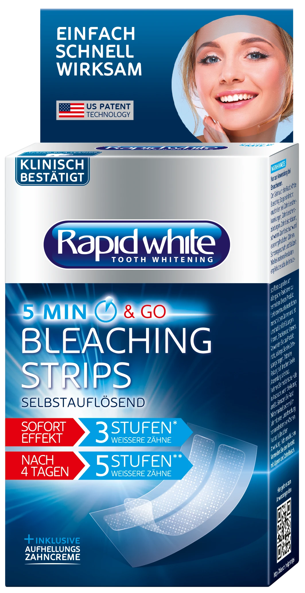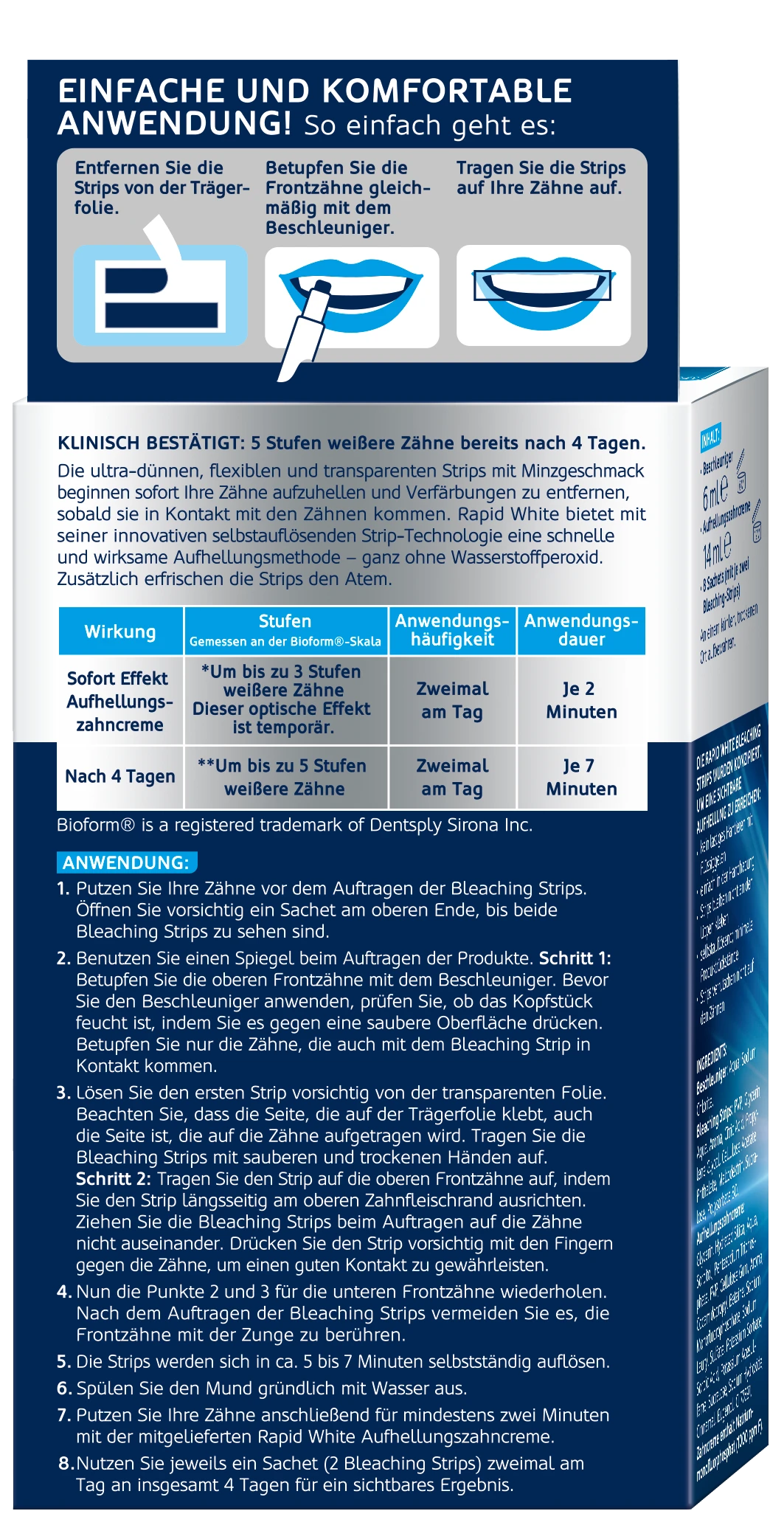 Nur zur Anwendung bei Erwachsenen. Der Gebrauch der Rapid White Bleaching Strips wird nicht empfohlen bei: Zahnfleischerkrankungen, Zahnfleischentzündungen, Zahnfleischbluten, schwerem Zahnfleischschwund oder empfindlichen Zähnen, Schwangerschaft und Stillzeit. Wie bei anderen Produkten empfiehlt es sich, die Inhaltsstoffliste zu prüfen, um allergische Reaktionen zu vermeiden. Dieses Produkt funktioniert nur bei natürlichen menschlichen Zähnen und ist unschädlich für Füllungen, Kronen, Brücken und Veneers. Verwenden Sie das Produkt nicht, solange Sie eine Zahnspange tragen. Tritt eine Reizung auf, brechen Sie die Anwendung sofort ab. Nehmen Sie medizinische Hilfe in Anspruch, wenn die Reizung anhält. Benutzen Sie Rapid White Bleaching Produkte maximal sechmal im Jahr mit einer Unterbrechung von mindestens vier Wochen. Nur zur äußerlichen Anwendung. Nicht verschlucken. Vermeiden Sie den Kontakt mit Lippen und Zahnfleisch.