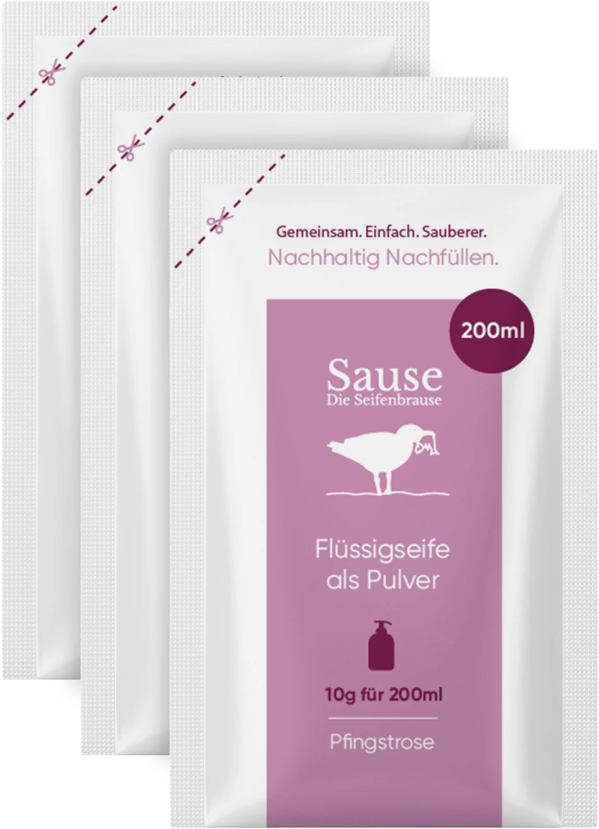 Fülle pro Papiertütchen Pulver 200 ml Wasser in einen Flüssigseifenspender. Anschließend das Pulver aus der Tüte in den Seifenspender geben und den Deckel aufdrehen. Nach dem Schütteln ist die Handseife fertig für den Gebrauch. Zum Hände waschen den Spender betätigen, Flüssigseife in den Händen aufschäumen und die Hände mit ausreichend Wasser abspülen.