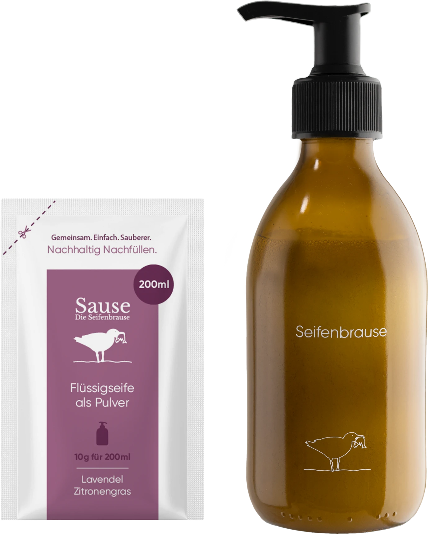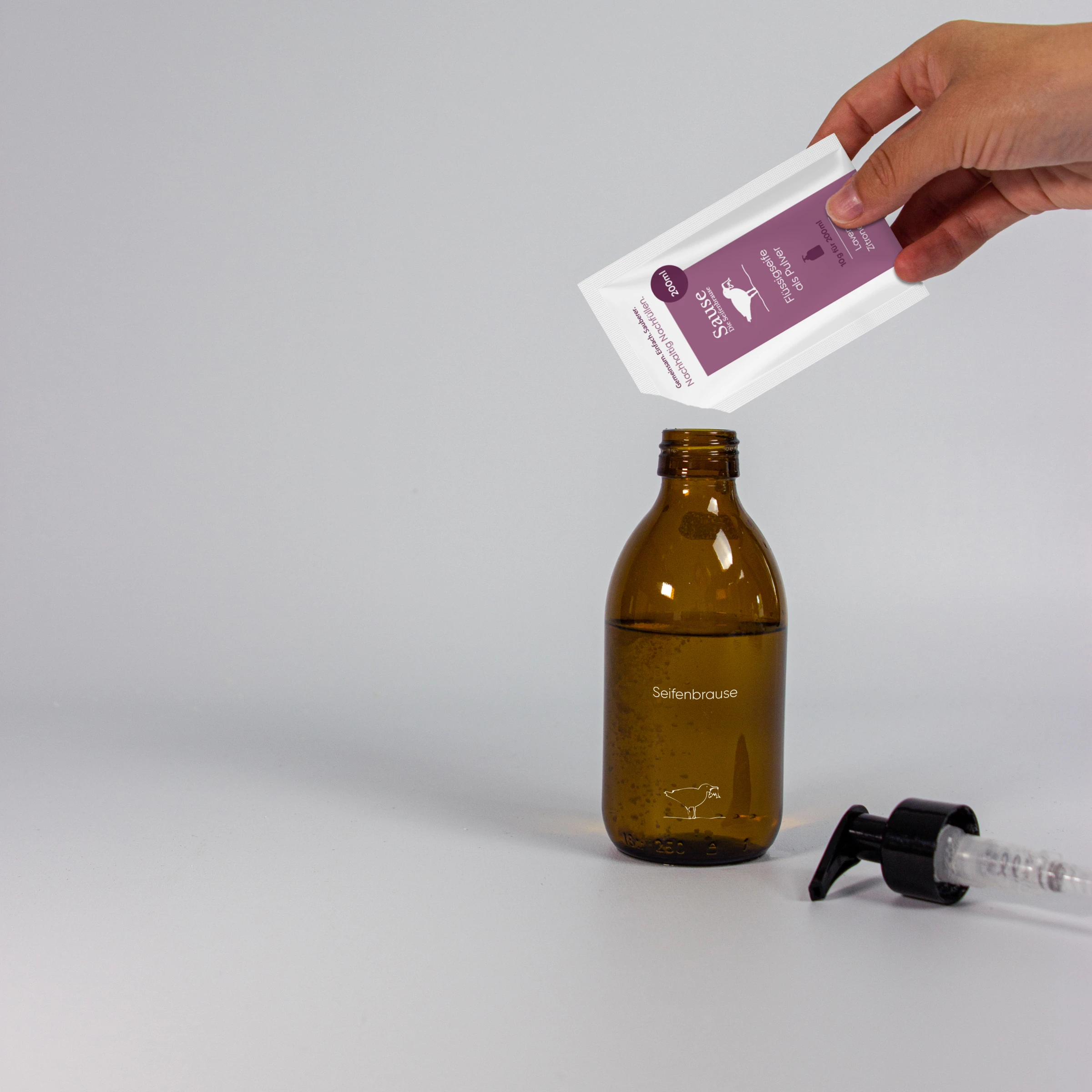 Fülle pro Papiertütchen Pulver 200 ml Wasser in einen Flüssigseifenspender. Anschließend das Pulver aus der Tüte in den Seifenspender geben und den Deckel aufdrehen. Nach dem Schütteln ist die Handseife fertig für den Gebrauch. Zum Hände waschen den Spender betätigen, Flüssigseife in den Händen aufschäumen und die Hände mit ausreichend Wasser abspülen.