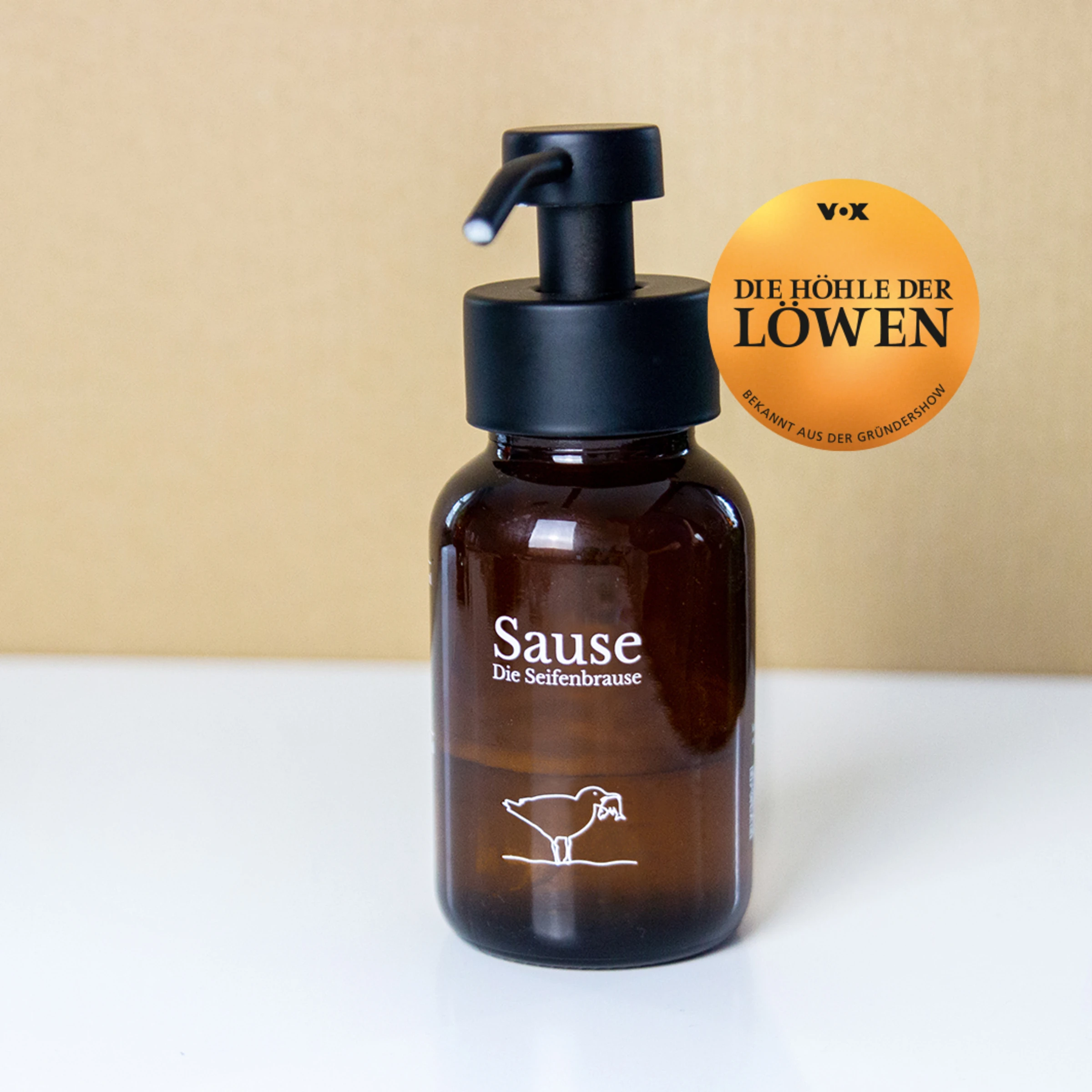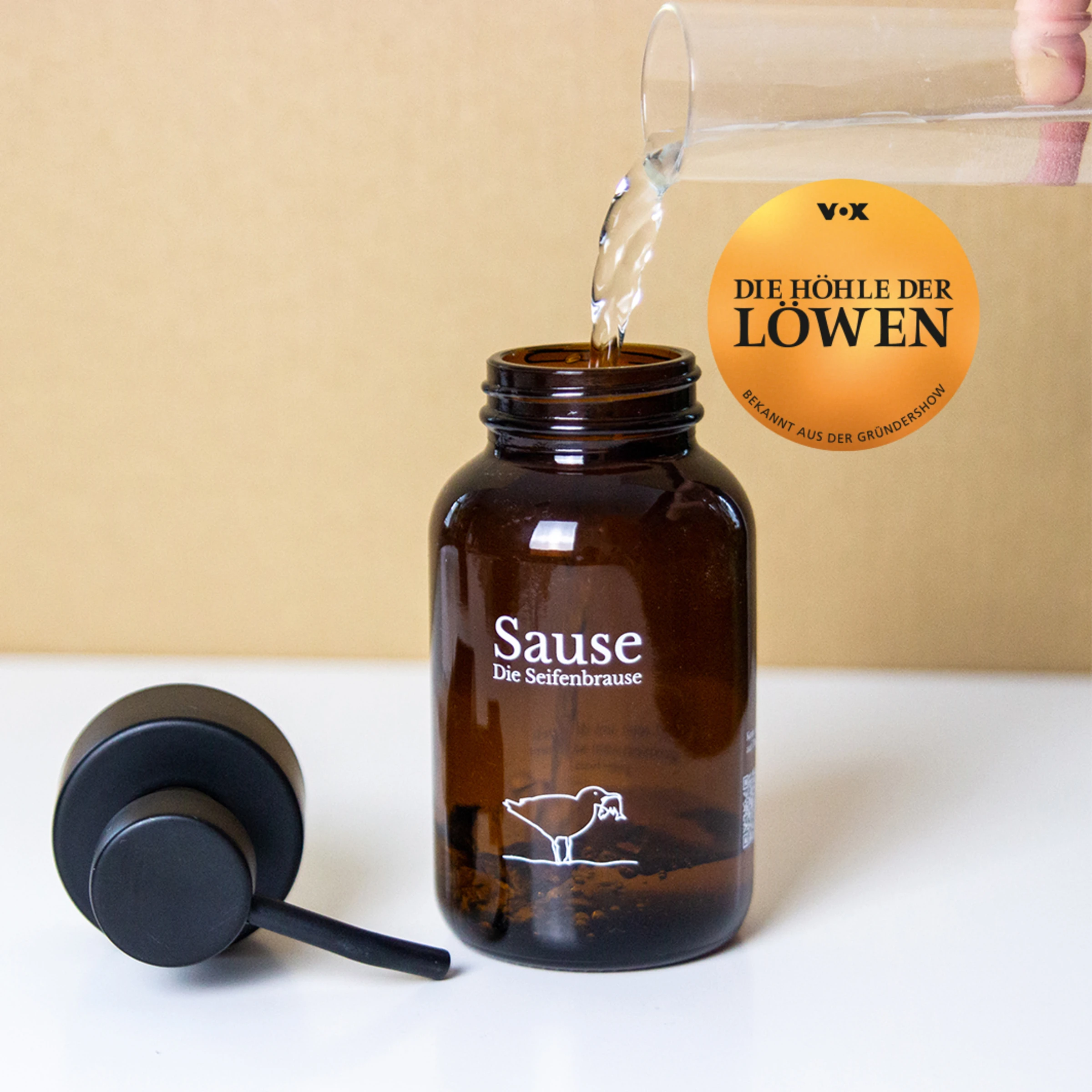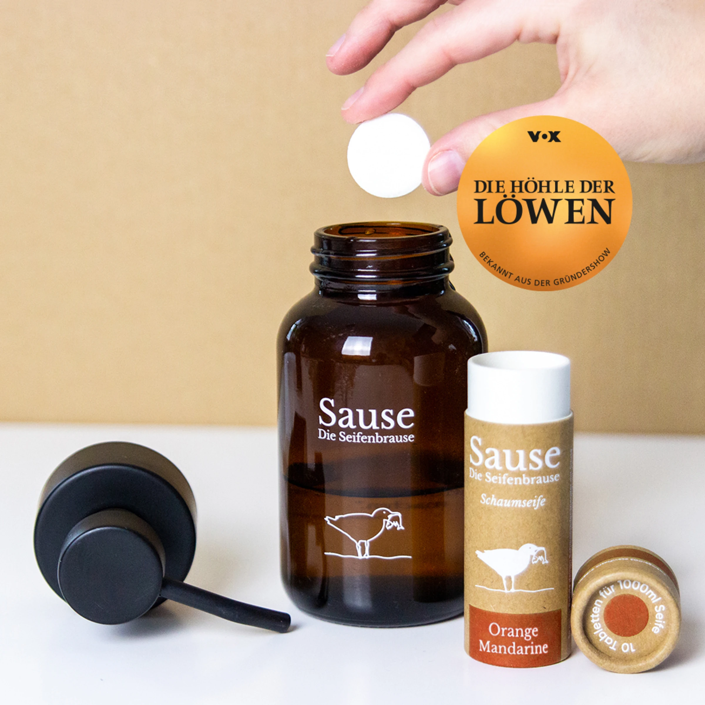 Das Set fĂĽr alle Sause-Starter*innen inklusive 10 Tabletten Sause Orange Mandarine und dem premium Schaumseifenspender aus Glas.
