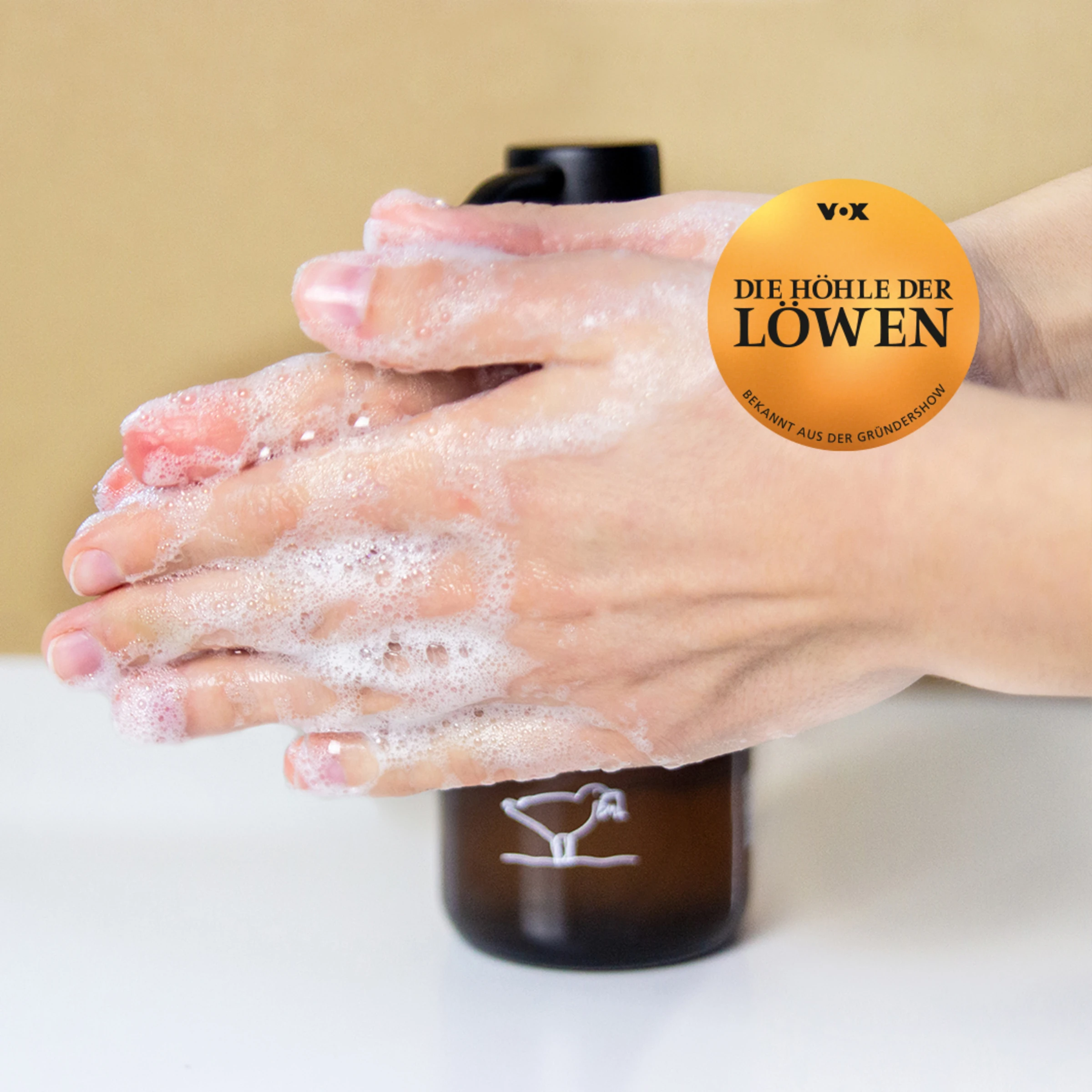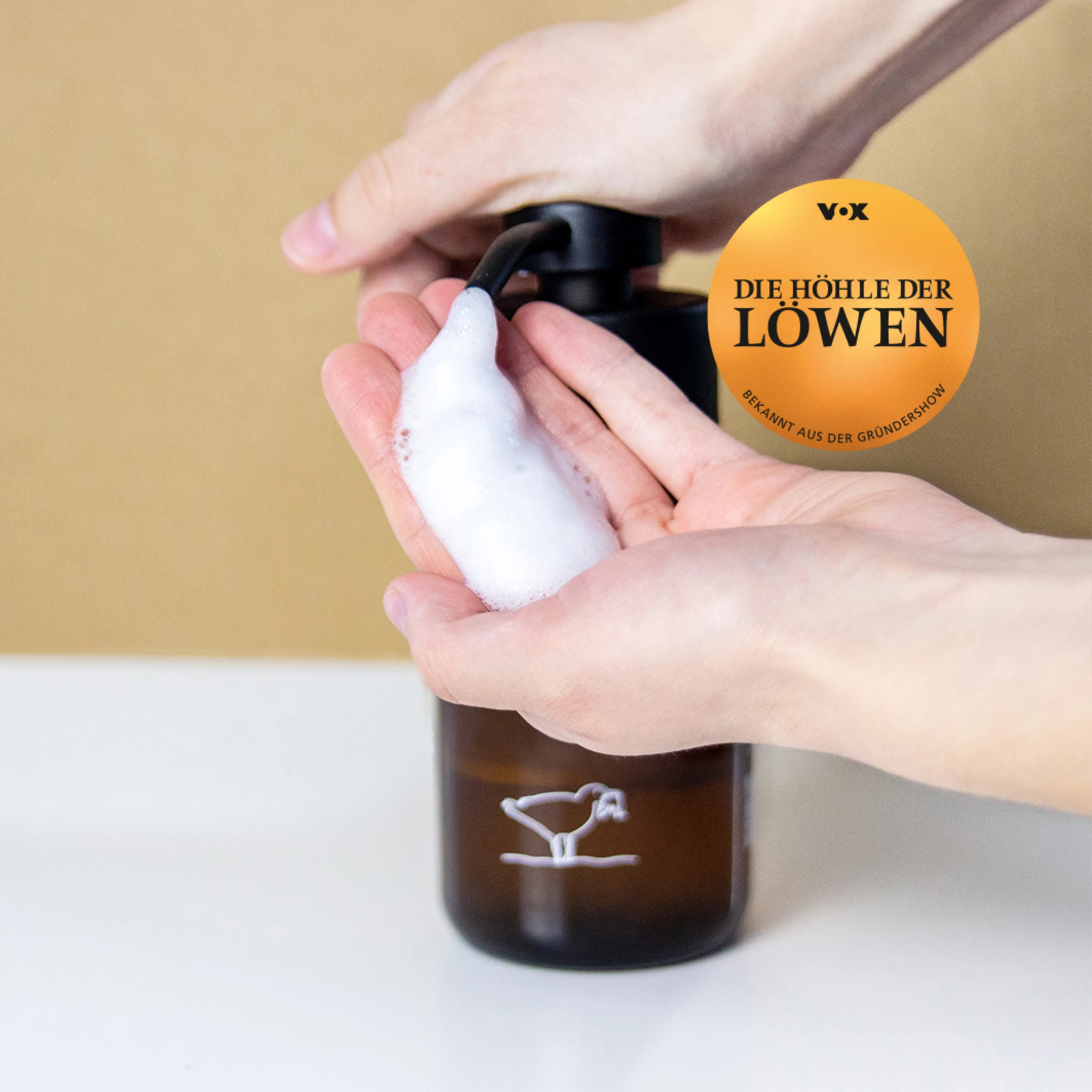 Gebe 100 ml warmes Wasser und eine Seifenbrause-Tablette in Deinen Schaumseifenspender. Nachdem sich die Tablette vollständig aufgelöst hat, kannst Du den Pumpkopf wieder auf das Glas schrauben und den Seifenschaum genießen.