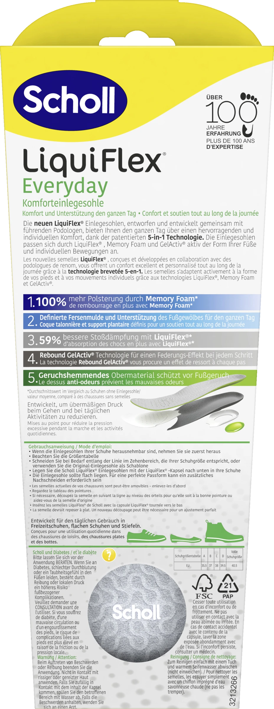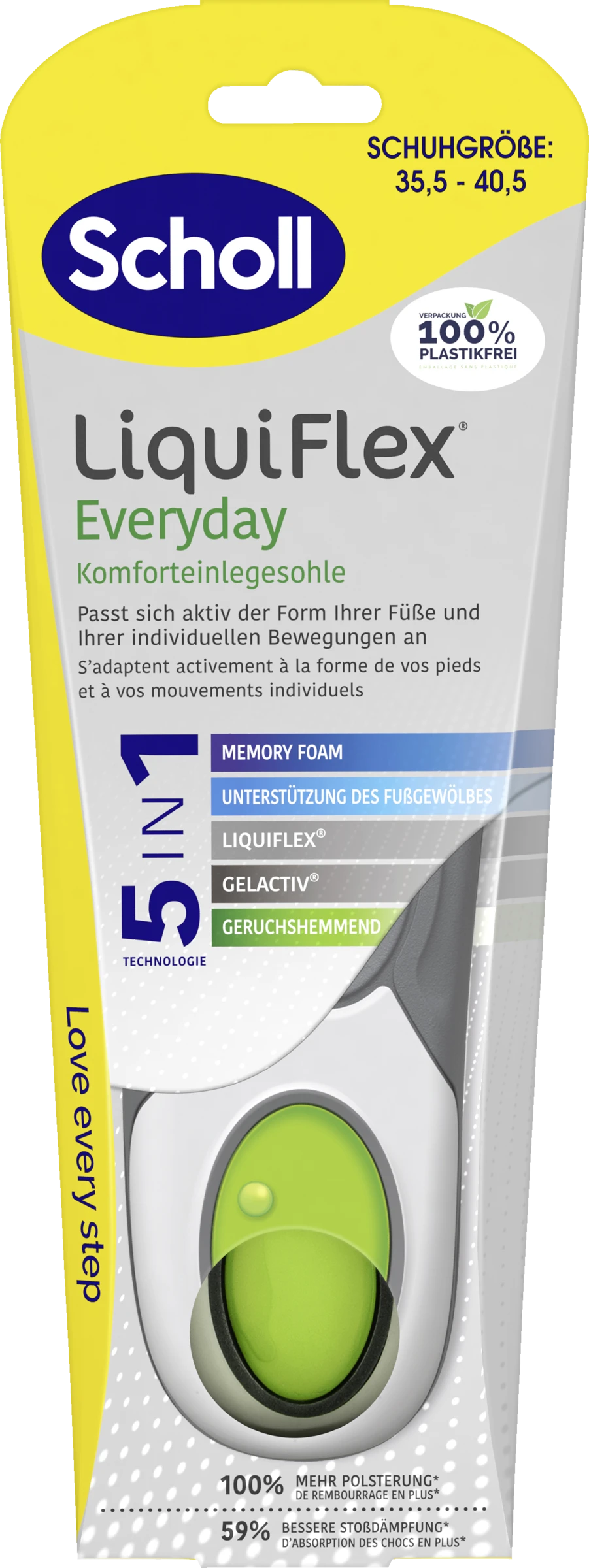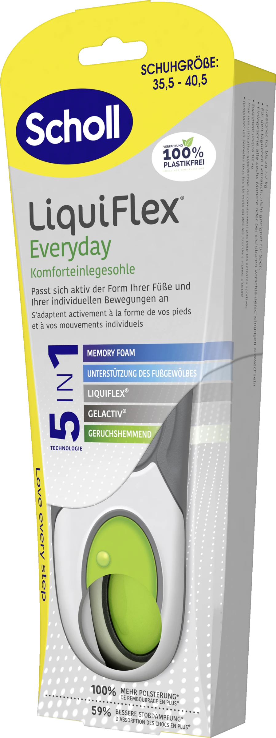Die neuen LiquiFlex Einlegesohlen, entworfen und entwickelt gemeinsam mit führenden Podologen, bieten Ihnen den ganzen Tag über einen hervorragenden und individuellen Komfort, dank der patentierten 5-in-1 Technologie. Die Einlegesohlen passen sich durch LiquiFlex, Memory Foam und GelActiv aktiv der Form Ihrer Füße und individuellen Bewegung an.