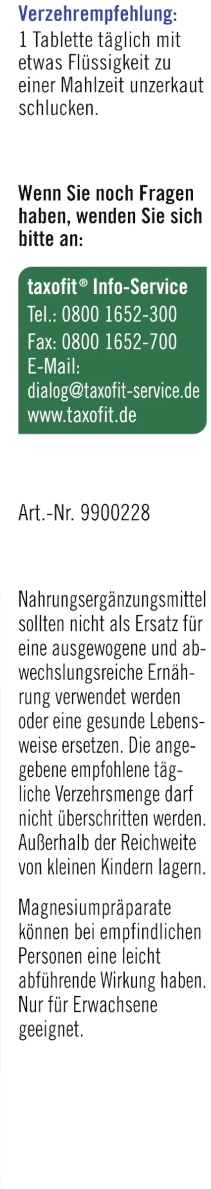 Nahrungsergänzungsmittel sollten nicht als Ersatz für eine ausgewogene und abwechslungsreiche Ernährung verwendet werden oder eine gesunde Lebensweise ersetzen. Die angegebene empfohlene tägliche Verzehrsmenge darf nicht überschritten werden. Außerhalb der Reichweite von kleinen Kindern lagern. Magnesiumpräparate können bei empfindlichen Personen eine leicht abführende Wirkung haben.#Nur für Erwachsene geeignet.#1 Tablette täglich mit etwas Flüssigkeit zu einer Mahlzeit unzerkaut schlucken.