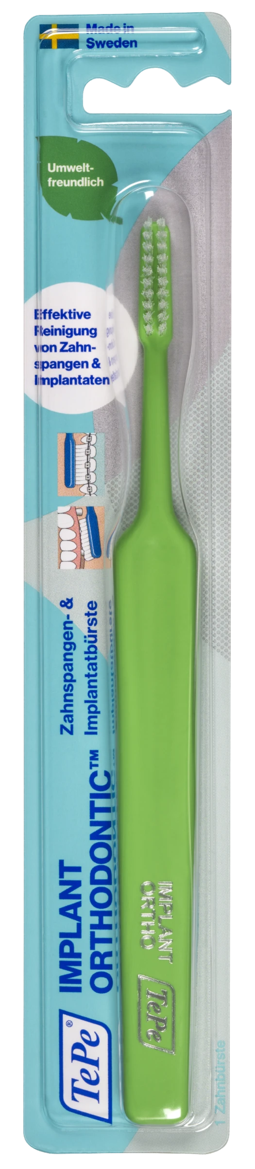 Die TePe Implant/Orthodontic™ ist eine spezielle Zahnbürste zur Reinigung von Implantaten und festsitzenden Zahnspangen.