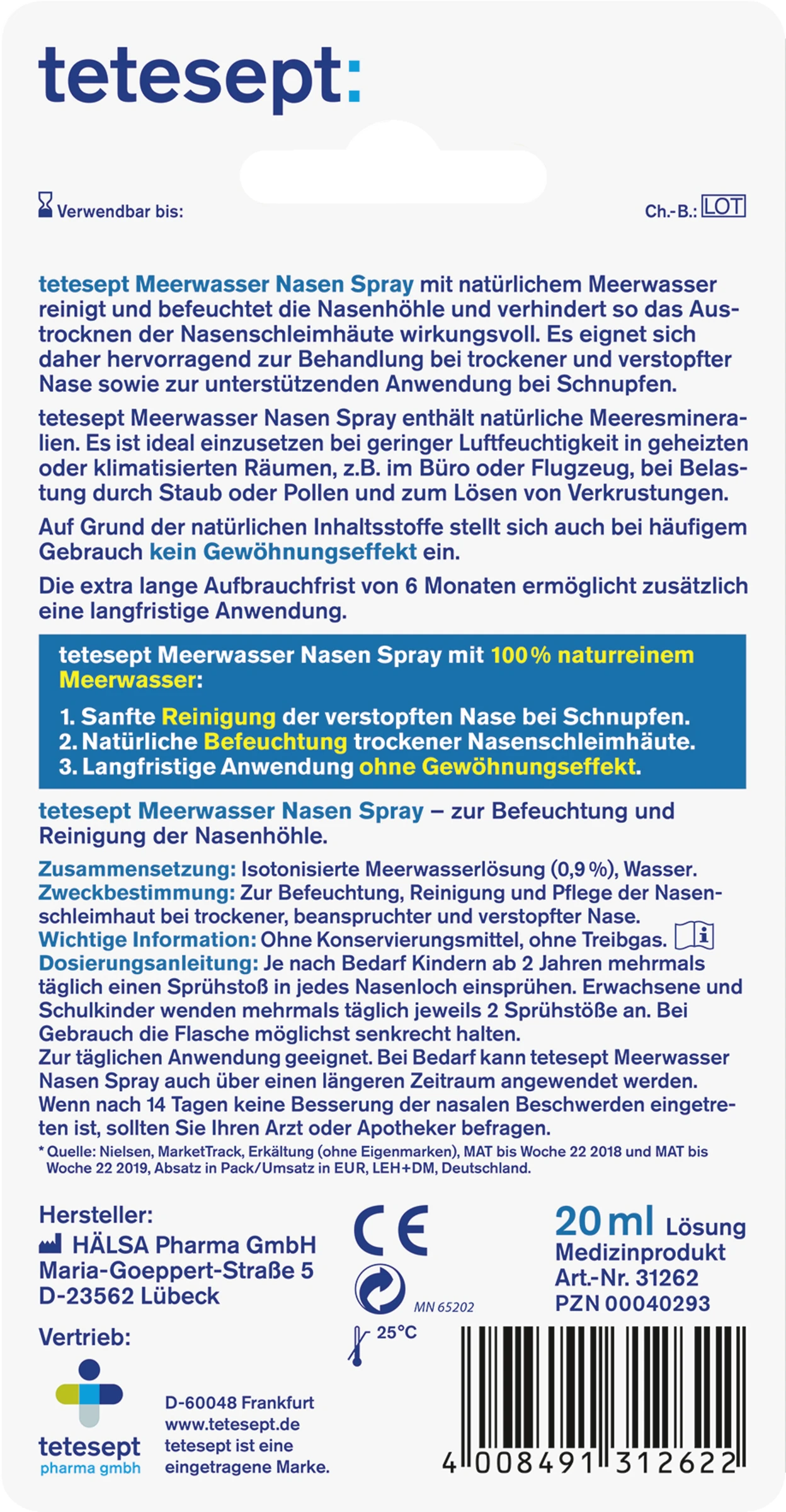 tetesept Meerwasser Nasenspray mit natürlichem Meerwasser ist in seiner Wirkung effektiv. Es reinigt und befeuchtet die Nasenhöhle und verhindert so das Austrocknen der Nasenschleimhäute wirkungsvoll. Es eignet sich daher hervorragend zur Behandlung bei trockener und verstopfter Nase sowie zur unterstützenden Anwendung bei Schnupfen.