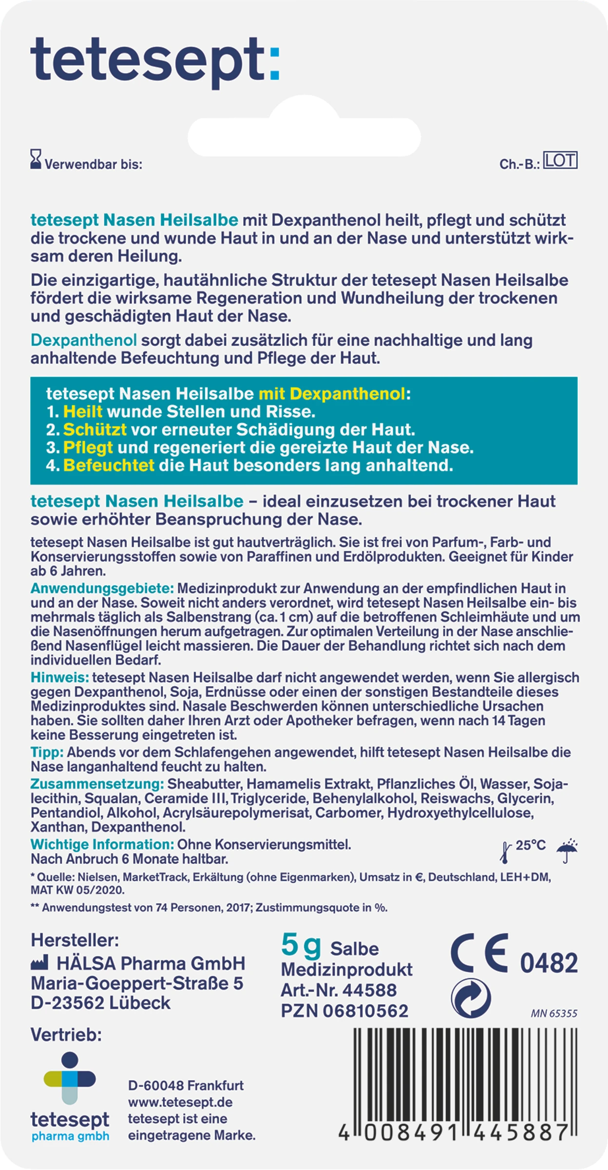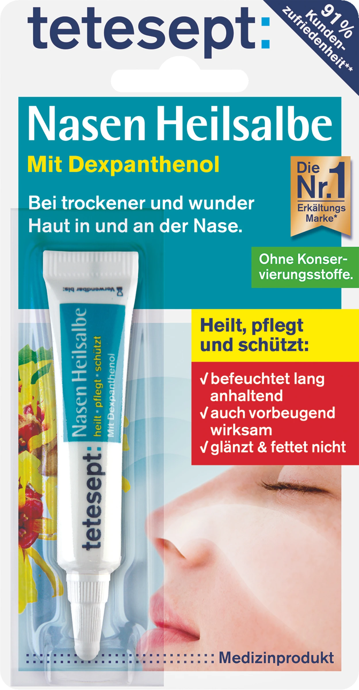 tetesept Nasen Heilsalbe ist eine Nasensalbe mit Dexpanthenol. Sie heilt, pflegt und schützt die trockene und wunde Haut in und an der Nase und unterstützt wirksam deren Heilung.