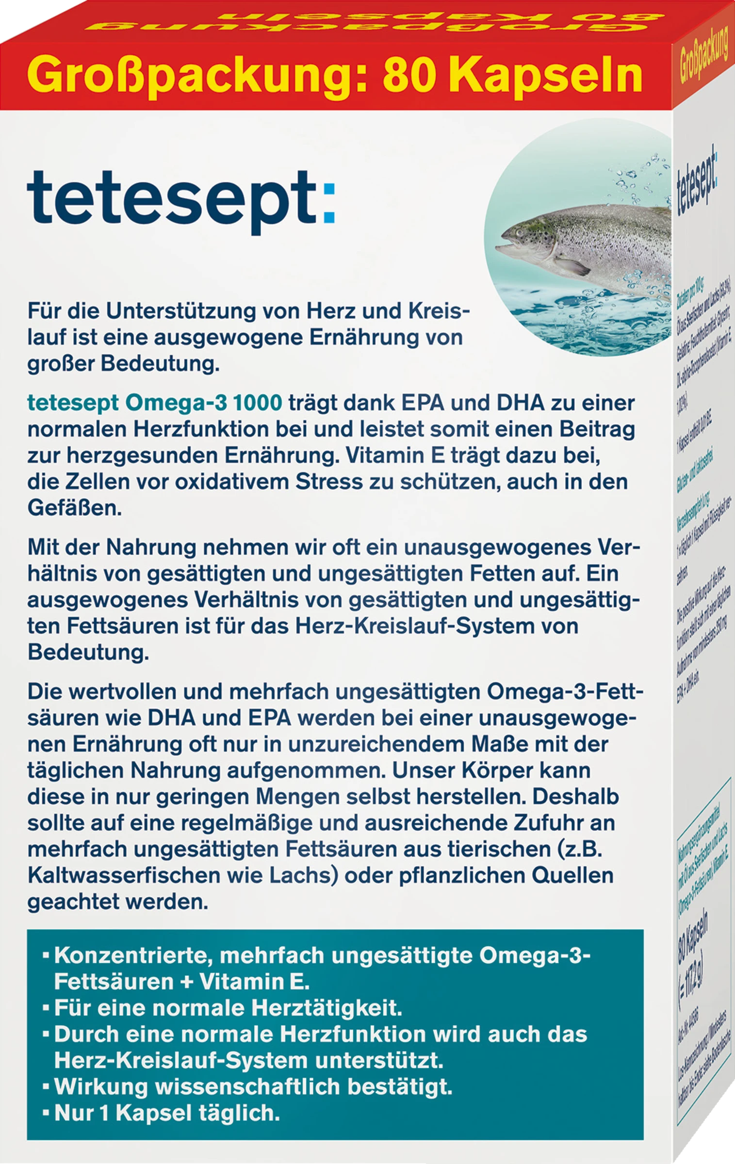 Die empfohlene tägliche Verzehrmenge darf nicht überschritten werden. Nahrungsergänzungsmittel sind kein Ersatz für eine abwechslungsreiche und ausgewogene Ernährung, die zusammen mit einer gesunden Lebensweise von Bedeutung ist. Für kleine Kinder unzugänglich aufbewahren. Die positive Wirkung auf die Herzfunktion stellt sich mit einer täglichen Aufnahme von mindestens 250 mg EPA + DHA ein.