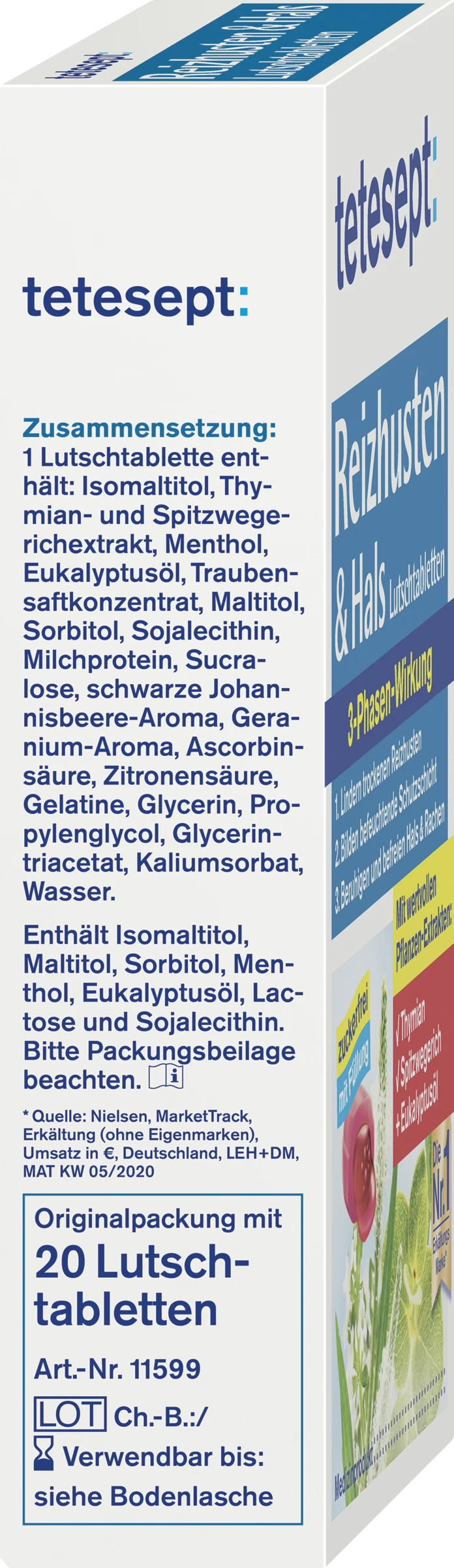 Soweit nicht anders verordnet, lassen Erwachsene und Kinder ab 6 Jahren bis zu 6 Lutschtabletten täglichim Mund zergehen. Damit die Inhaltstoffe möglichst lange auf Hals und Rachen einwirken können, lösen sich tetesept Reizhusten & Hals Lutschtabletten langsam auf.