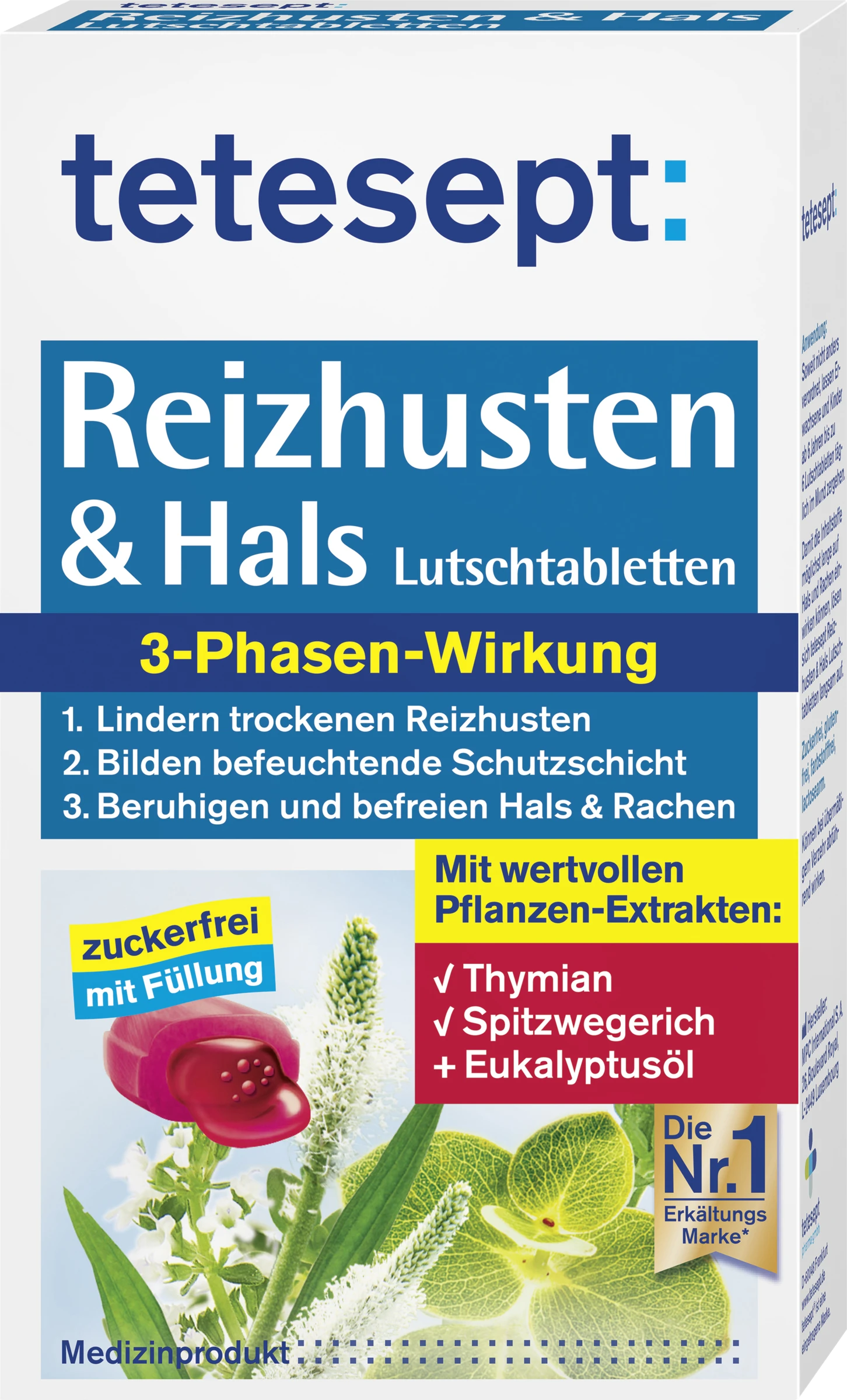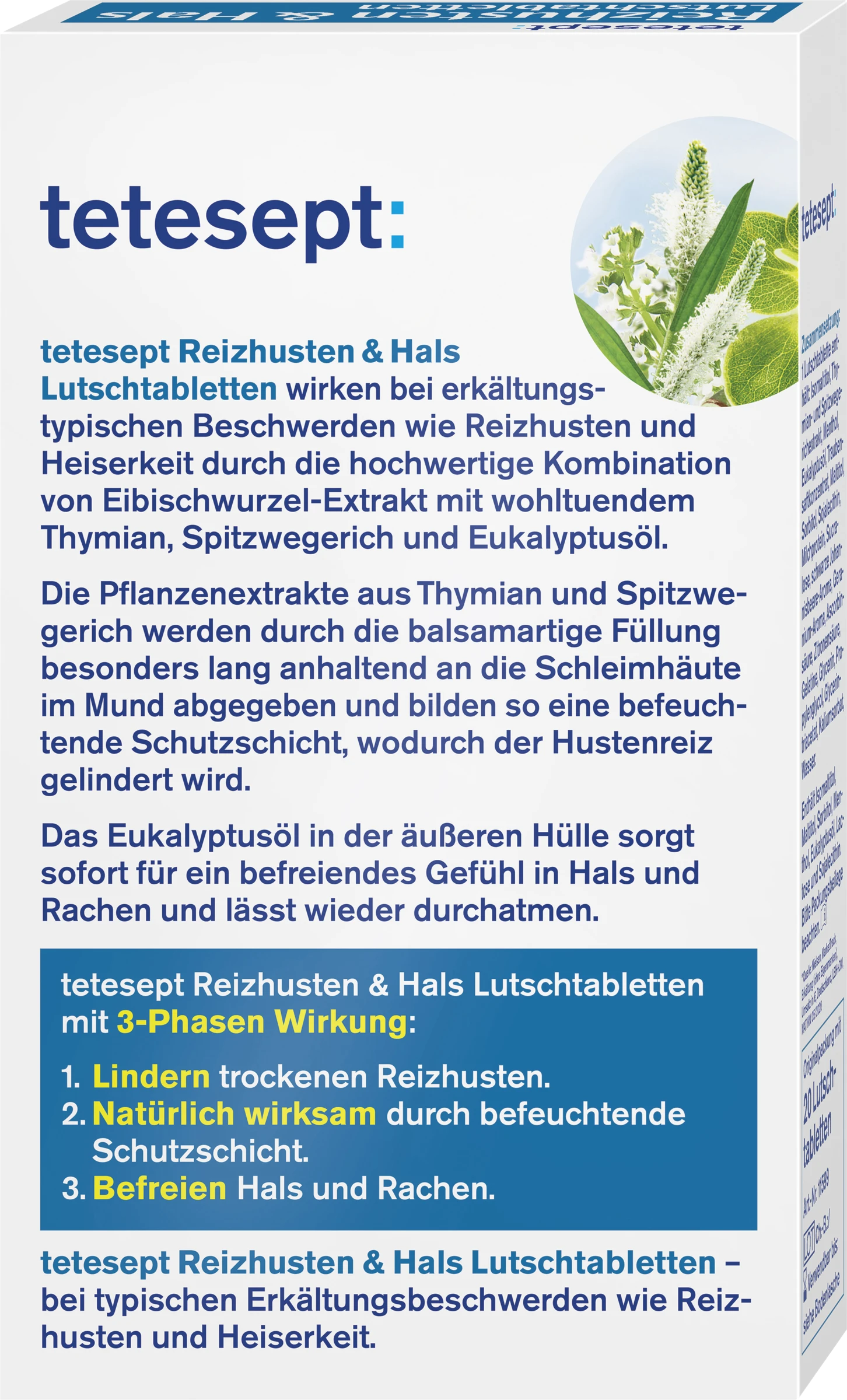 tetesept Husten Lutschtabletten wirken bei erkältungstypischen Beschwerden im Hals wie Reizhusten undHeiserkeit durch die hochwertige Kombination von Thymian, Spitzwegerich und Eukalyptusöl.Die Pflanzenextrakte aus Thymian und Spitzwegerich werden durch die balsamartige Füllung besonderslang anhaltend an die Schleimhäute im Mund abgegeben und bilden so eine befeuchtende Schutzschicht,wodurch der Hustenreiz gelindert wird.Das Eukalyptusöl in der äußeren Hülle sorgt sofort für ein befreiendes Gefühl in Hals und Rachen und lässtwieder durchatmen.tetesept Reizhusten & Hals Lutschtabletten mit 3-Phasen Wirkung:
