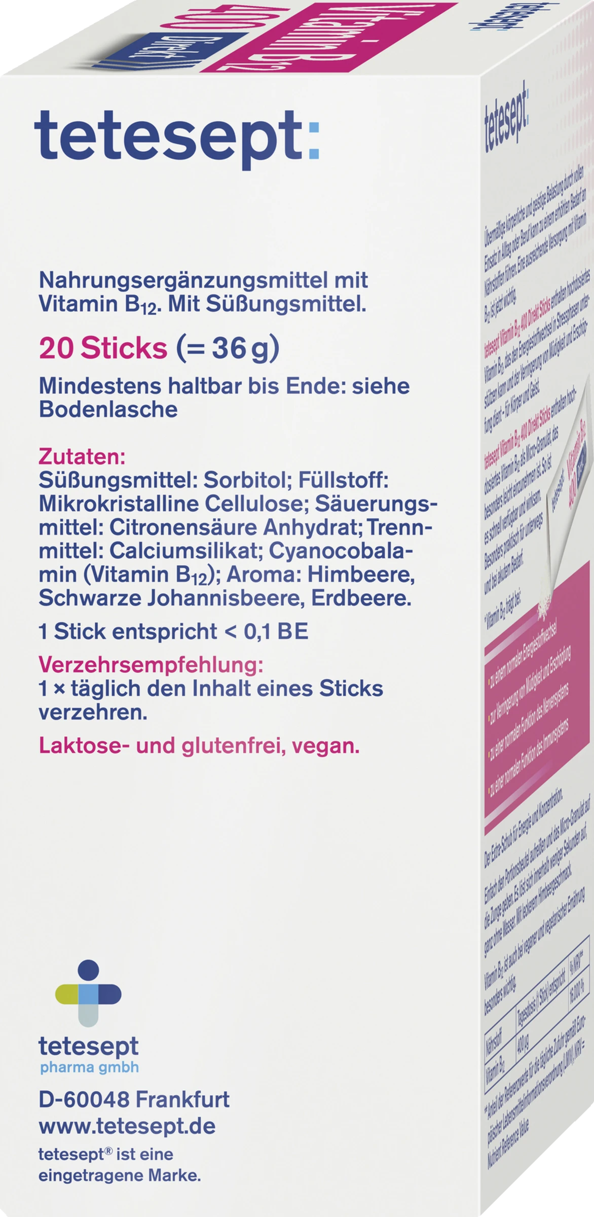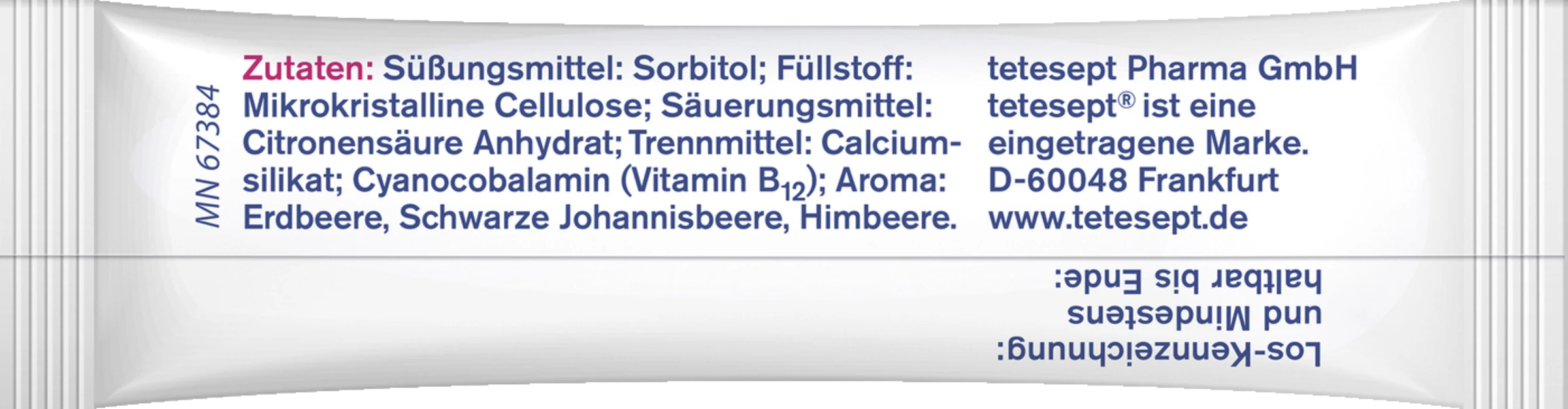 Süßungsmittel: Sorbitol; Füllstoff: Mikrokristalline Cellulose; Säuerungsmittel: Citronensäure Anhydrat; Trennmittel: Calciumsilikat; Cyanocobalamin (Vitamin B12); Aroma: Erdbeere, Schwarze Johannisbeere, Himbeere. 1 Stick entspricht <0,1 BE.