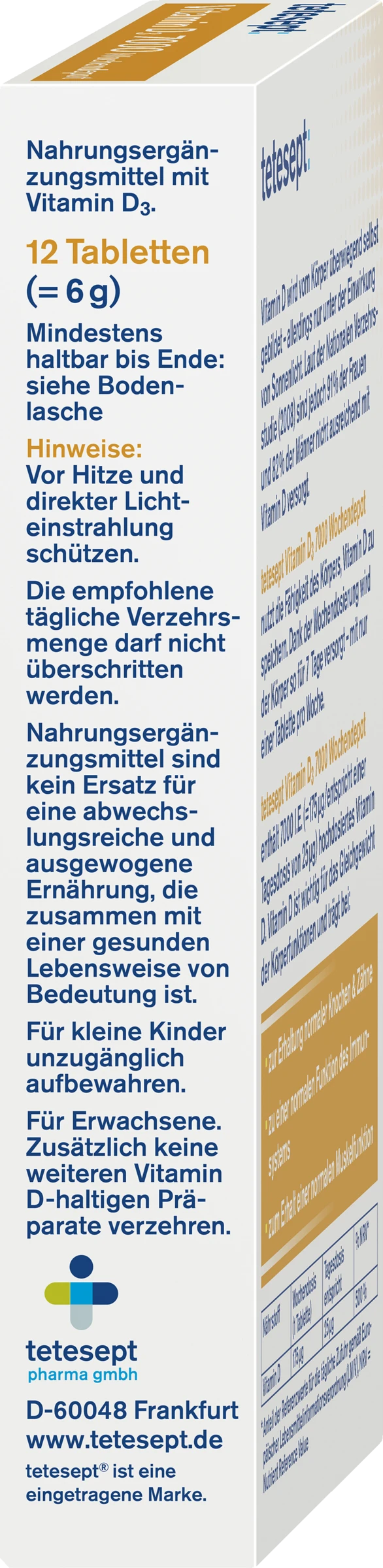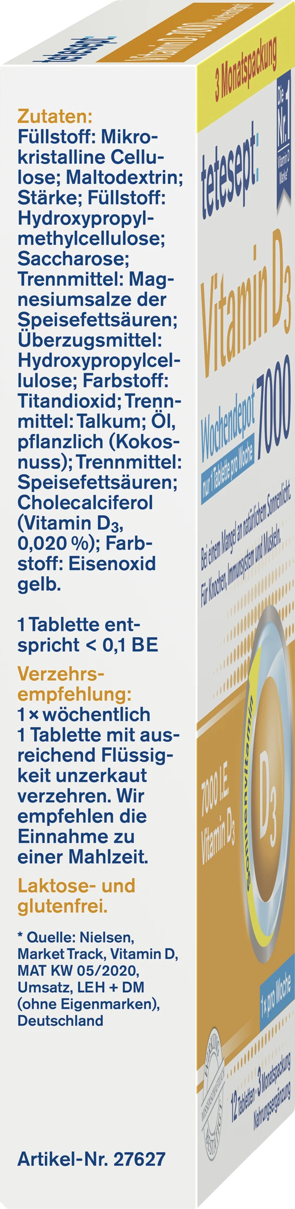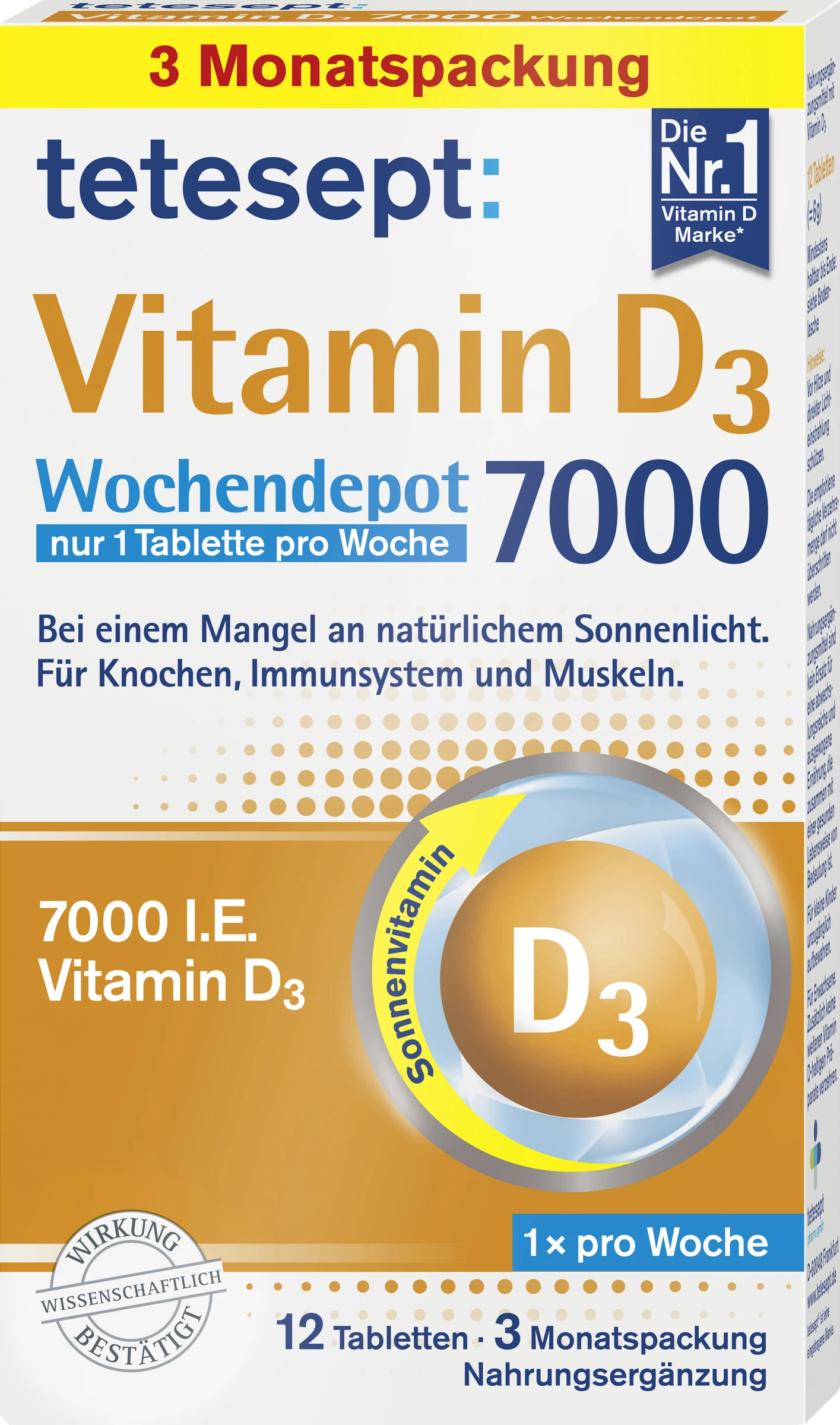 Vitamin D wird vom Körper überwiegend selbst gebildet – allerdings nur unter der Einwirkung von Sonnenlicht. Laut der Nationalen Verzehrsstudie (2008) sind jedoch 91% der Frauen und 82% der Männer nicht ausreichend mit Vitamin D versorgt. tetesept Vitamin D3 7000 Wochendepot nutzt die Fähigkeit des Körpers, Vitamin D zu speichern. Dank der Wochendosierung wird der Körper so für 7 Tage versorgt – mit nur einer Tablette pro Woche.