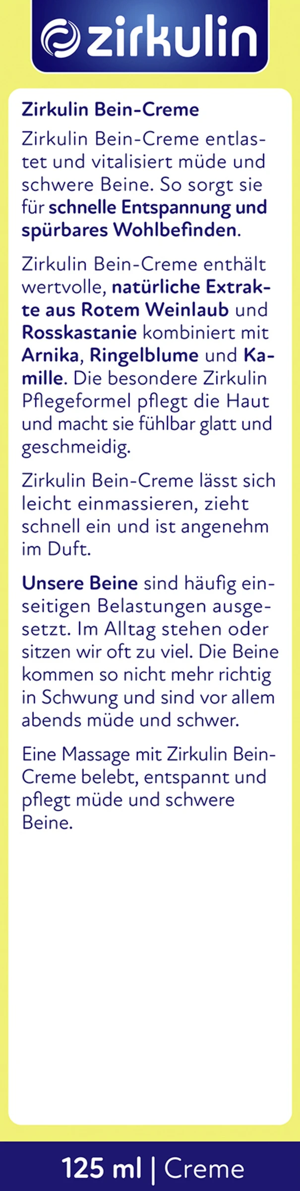 Die Zirkulin Bein-Creme entlastet und vitalisiert müde und schwere Beine. So sorgt sie für schnelle Entspannung und spürbares Wohlbefinden.