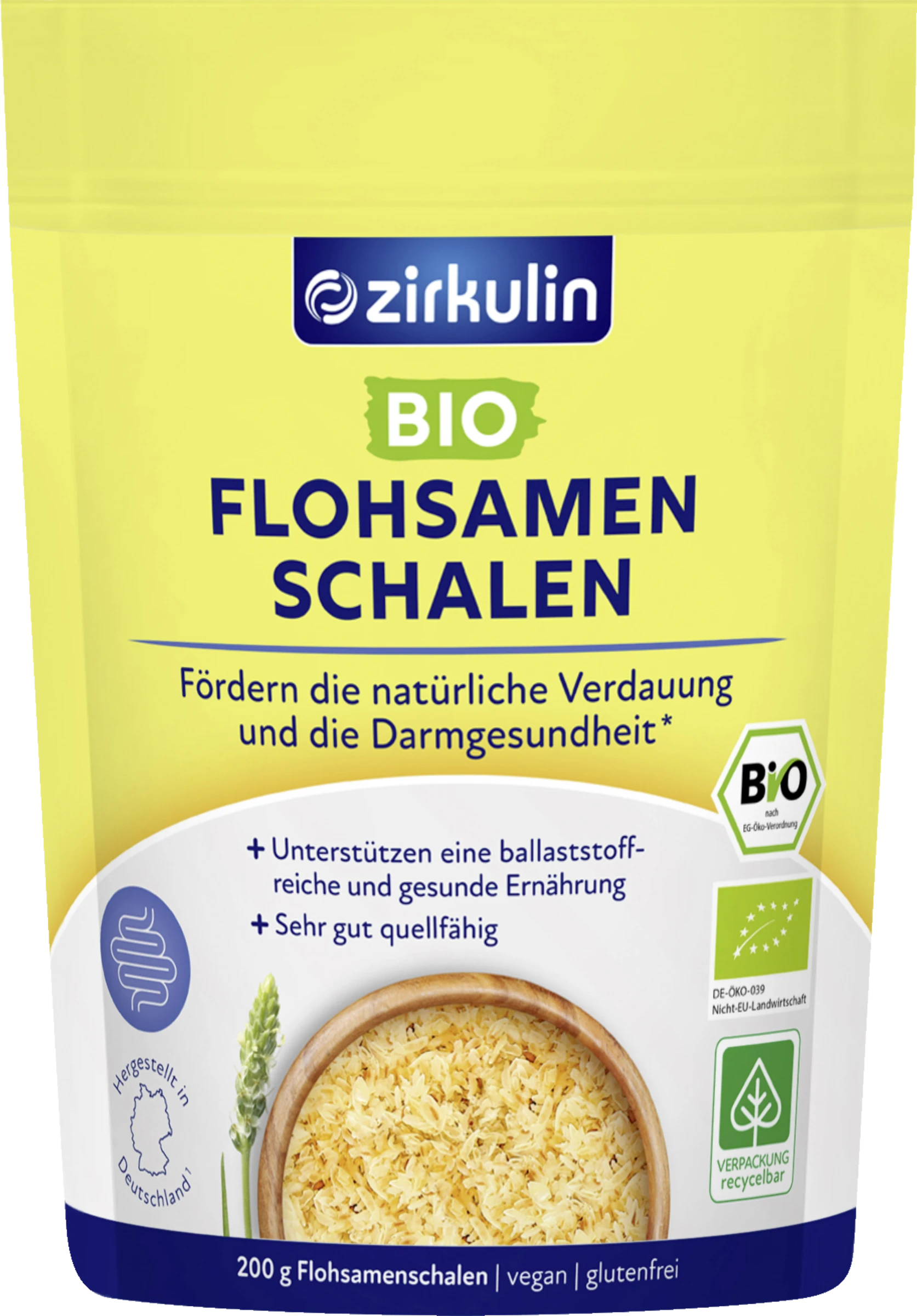 Zirkulin Bio Flohsamenschalen unterstützen eine ballaststoffreiche und gesunde Ernährung. Die Samenschalen des Indischen Flohsamens (Plantago Ovata) haben einen hohen Gehalt an löslichen und sehr gut quellfähigen Ballaststoffen.