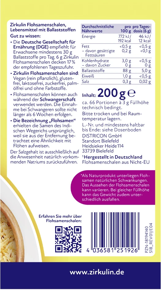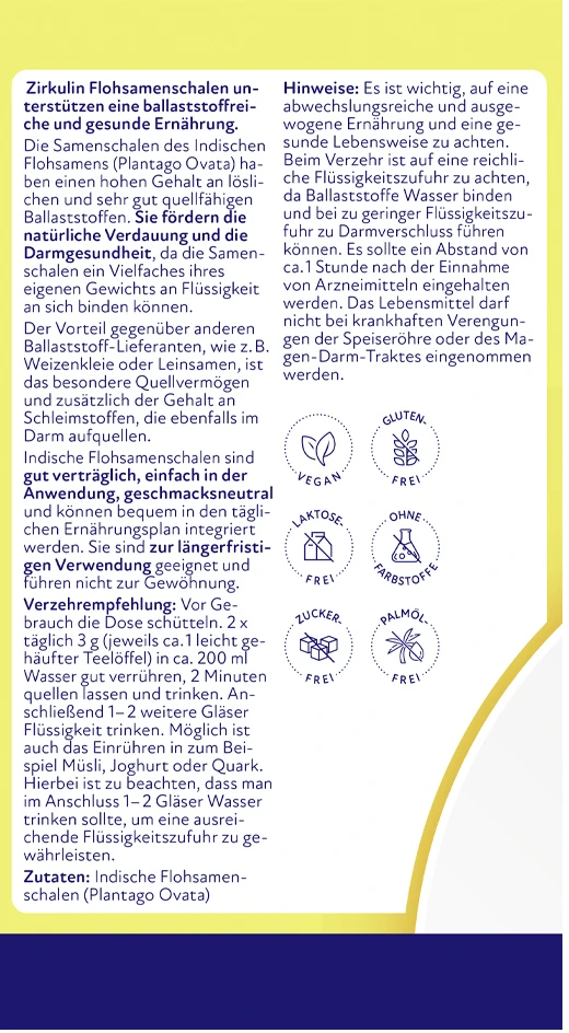 Zirkulin Flohsamenschalen sind ein Nahrungsergänzungsmittel und sollten kein Ersatz für eine ausgewogene und abwechslungsreiche Ernährung und eine gesunde Lebensweise sein.